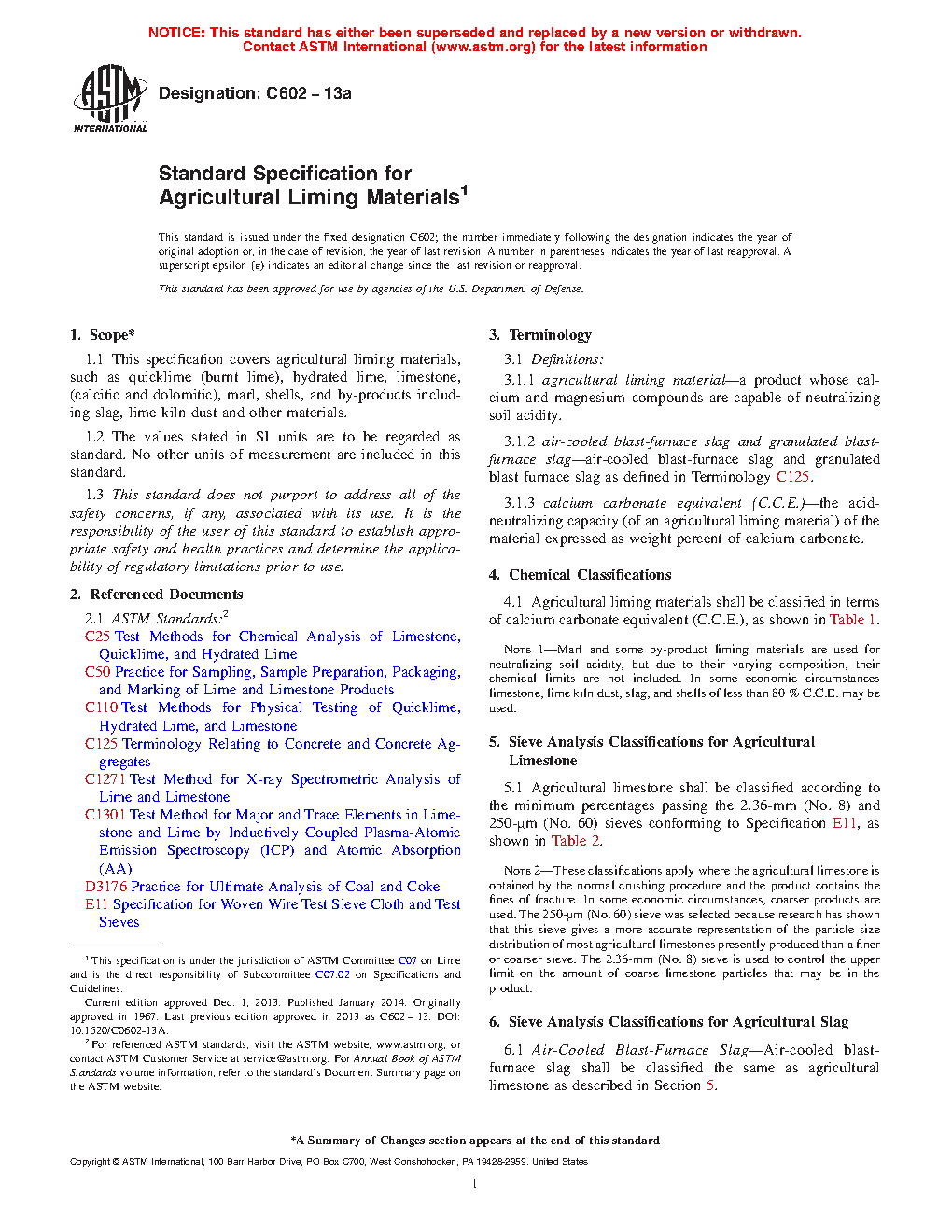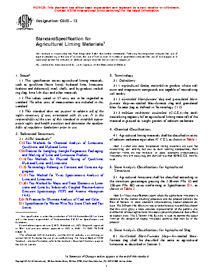 This specification covers agricultural liming materials, such as quicklime (burnt lime), hydrated lime, limestone, (calcitic and dolomitic), marl, shells, and by-products including slag, and other materials. Agricultural liming materials shall be classified in terms of calcium carbonate equivalent. Hydrated lime, quicklime, and agricultural slag shall be classified depending on the particle size. In sieve analysis of agricultural liming materials, the amount of liming material passing the sieves to the nearest whole percentage of the total weight of the dry sample shall be calculated. Air-cooled blast-furnace slag shall be classified the same as agricultural limestone. The following results for agricultural liming materials shall be reported: percentage calcium carbonate equivalent, percentage moisture, percentage calcium and magnesium, and sieve analysis.