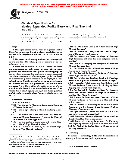 This specification covers molded expanded perlite block, fittings, and pipe thermal insulation intended for use on surfaces with temperatures of certain range. The insulation shall not have visible defects that will adversely affect its service qualities. Different test methods shall be performed in order to determine the properties of the block, fitting, and pipe insulations: density, apparent thermal conductivity, linear shrinkage after heat soaking, flexural strength, compressive strength, weight loss by tumbling, moisture content, water absorption after heat aging, surface bearing characteristics, hot-surface performance, and stress corrosion cracking of austenitic stainless steel.
