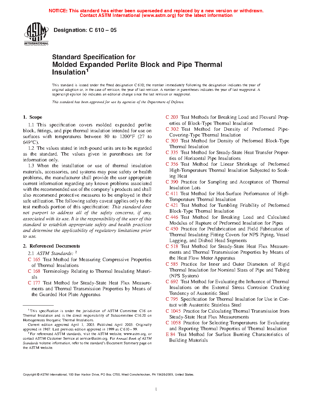 1.1 This specification covers molded expanded perlite block, fittings, and pipe thermal insulation intended for use on surfaces with temperatures between 80 to 1200°F (27 to 649°C).