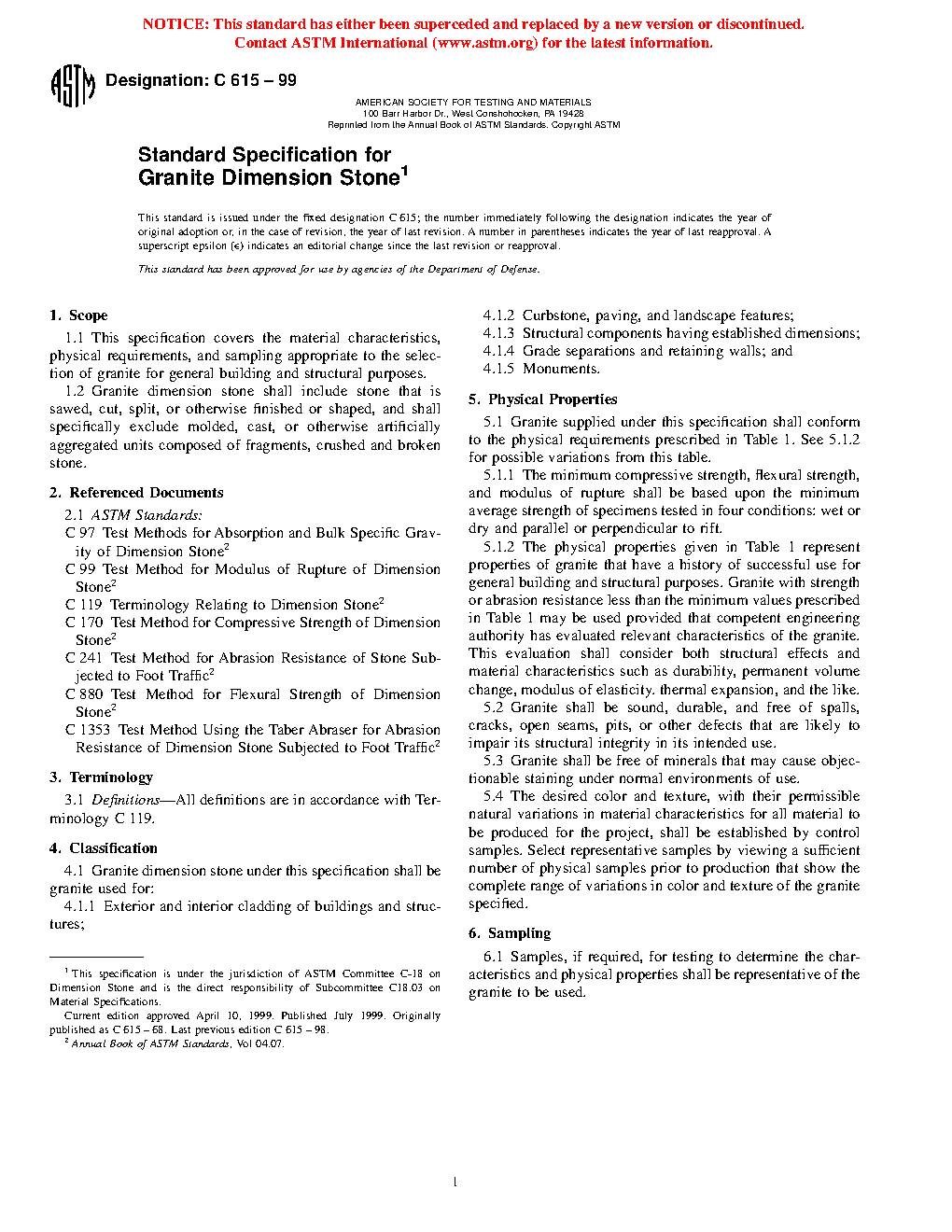 1.1 This specification covers the material characteristics, physical requirements, and sampling appropriate to the selection of granite for general building and structural purposes.