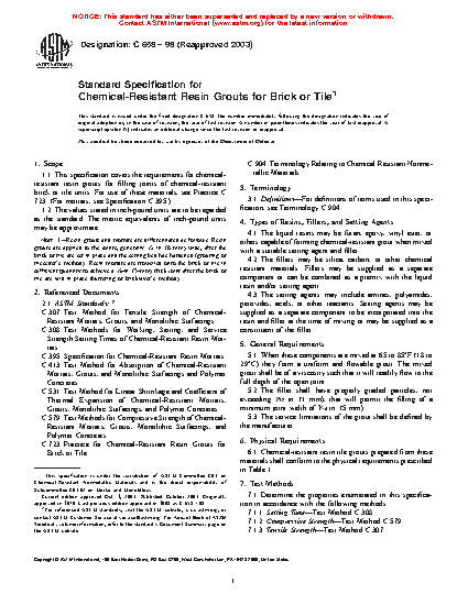 1.1 This specification covers the requirements for chemical-resistant resin grouts for filling joints of chemical-resistant brick or tile units. For use of these materials, see Practice C 723