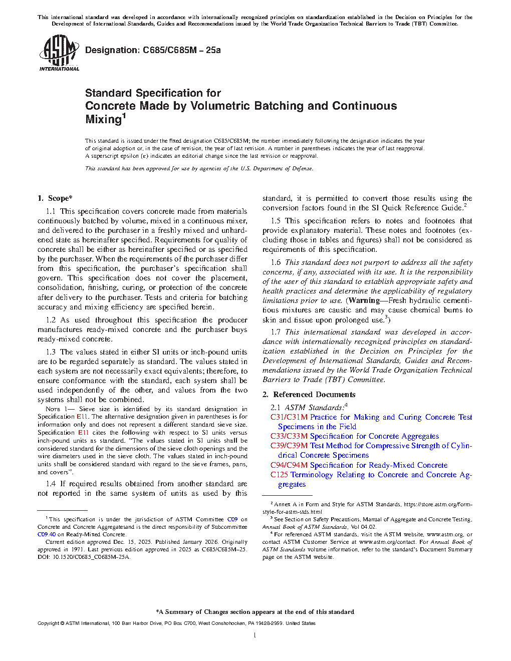 1.1 This specification covers concrete made from materials continuously batched by volume, mixed in a continuous mixer, and delivered to the purchaser in a freshly mixed and unhardened state as hereinafter specified. Requirements for quality of concrete shall be either as hereinafter specified or as specified by the purchaser. When the requirements of the purchaser differ from this specification, the purchaser's specification shall govern. This specification does not cover the placement, consolidation, finishing, curing, or protection of the concrete after delivery to the purchaser. Tests and criteria for batching accuracy and mixing efficiency are specified herein.