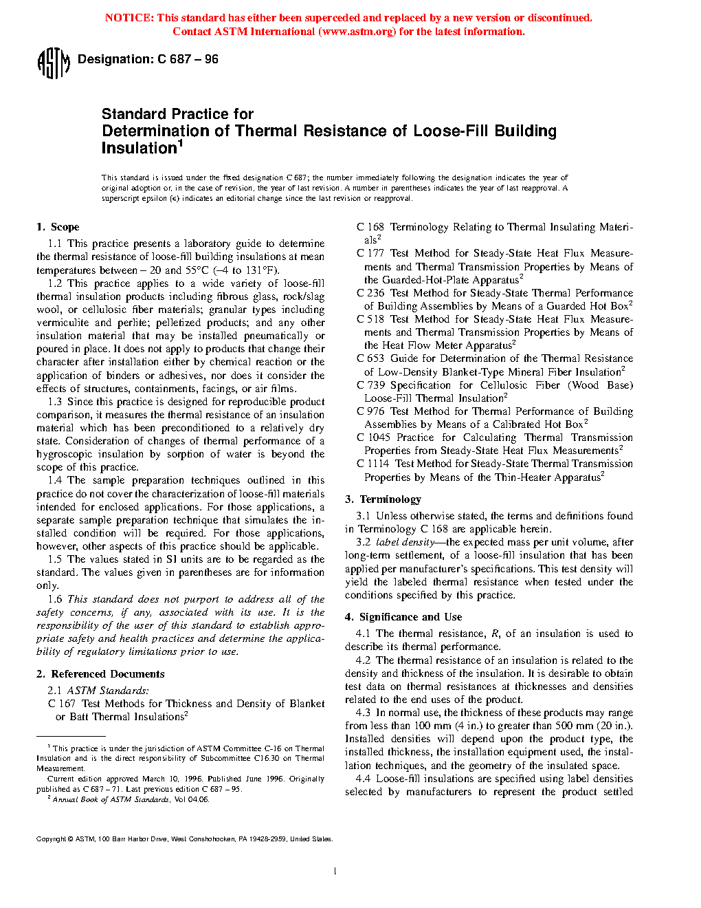 4.12 Loosefill insulation installed in attic applications will have heat flow up during the winter. At winter design conditions in many areas, the winter design temperature difference will cause convective heat transfer to occur within some loose-fill insulations. The procedure outlined in Practice C687 is not applicable to that measurement unless a Test Method C1363 test apparatus is used to reproduce the correct boundary conditions. To determine how seasonal differences can affect product performance, use Practice C1373. Practice C1373 measures the expected winter thermal performance of loose-fill insulation under simulated winter design temperature conditions and provides specimen requirements necessary for that determination.