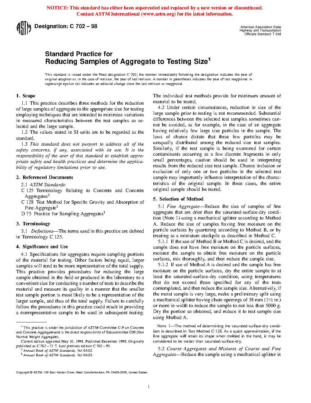 ASTM C702-98(2003) (R1998)