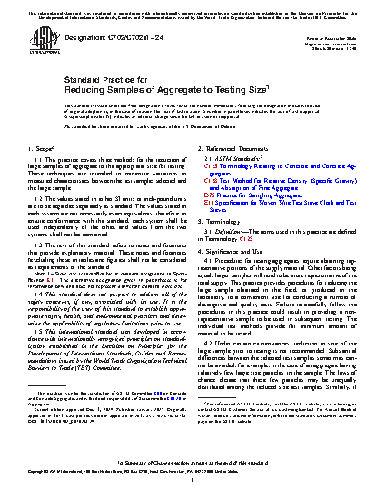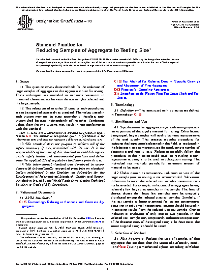 1.1 This practice covers three methods for the reduction of large samples of aggregate to the appropriate size for testing. These techniques are intended to minimize variations in measured characteristics between the test samples selected and the large sample.