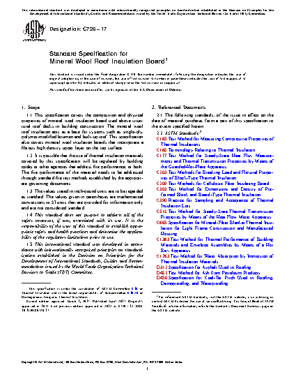 1.1 This specification covers the composition and physical properties of mineral wool insulation board used above structural roof decks in building construction. The mineral wool roof insulation acts as a base for systems such as single-ply, polymer-modified bitumen and built-up roof. This specification also covers mineral wool insulation boards that incorporate a fibrous high density upper layer on the top surface