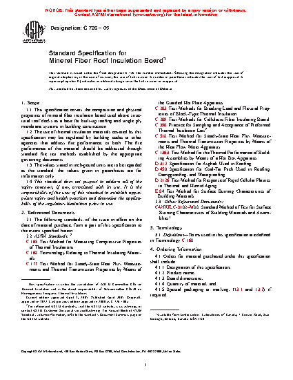 This specification covers the composition and physical properties of mineral fiber insulation board used above structural roof decks as a base for built-up roofing and single ply membrane systems in building construction. The use of thermal insulation materials covered by this specification may be regulated by building codes or other agencies that address fire performance, or both. Specimens shall be sampled, prepared, tested, and conform accordingly to the following physical properties: compressive resistance, tensile strength, breaking load strength, water absorption, response to thermal and humid aging, linear dimensional change, thermal resistance, surface burning characteristics, and dimensions.