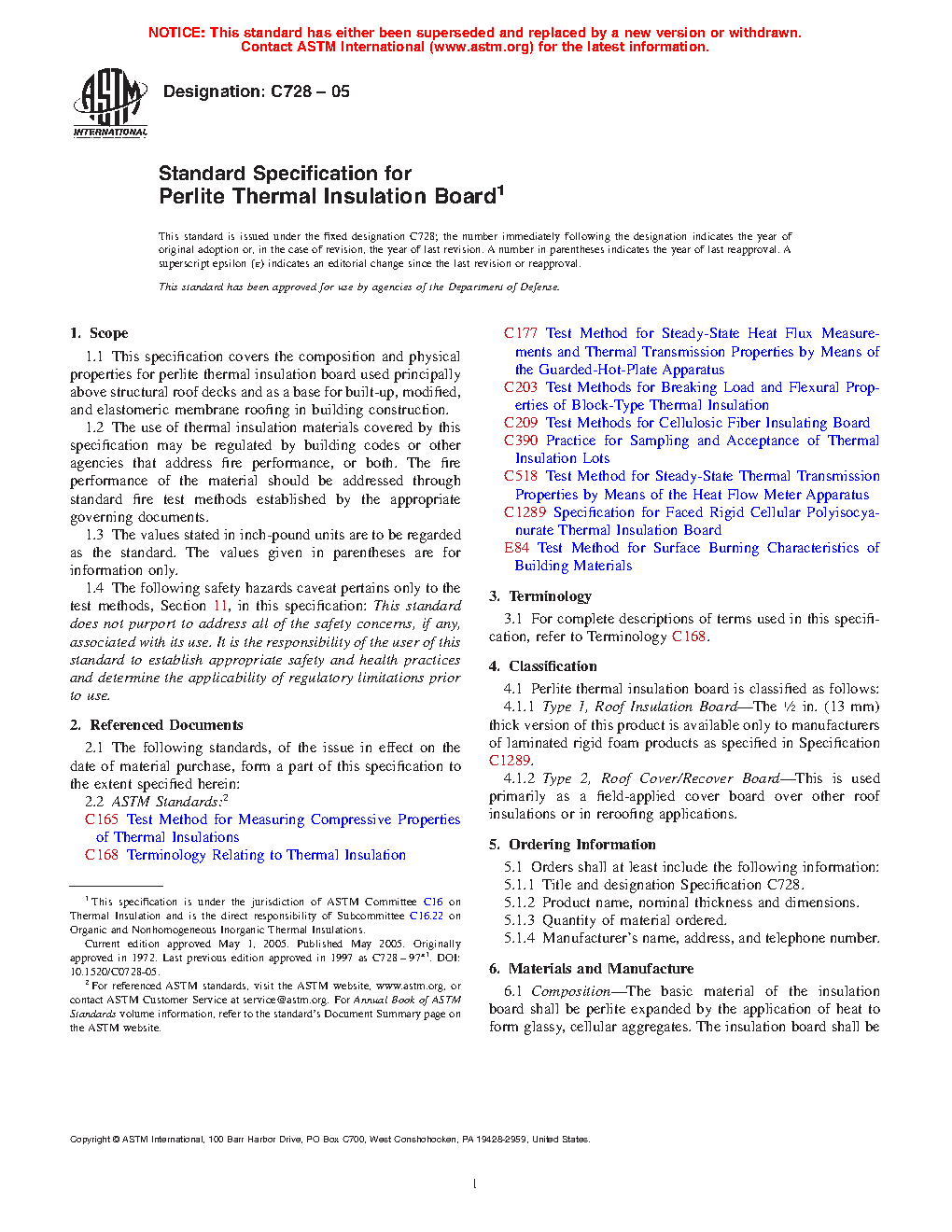 1.1 This specification covers the composition and physical properties for perlite thermal insulation board used principally above structural roof decks and as a base for built-up, modified, and elastomeric membrane roofing in building construction.
