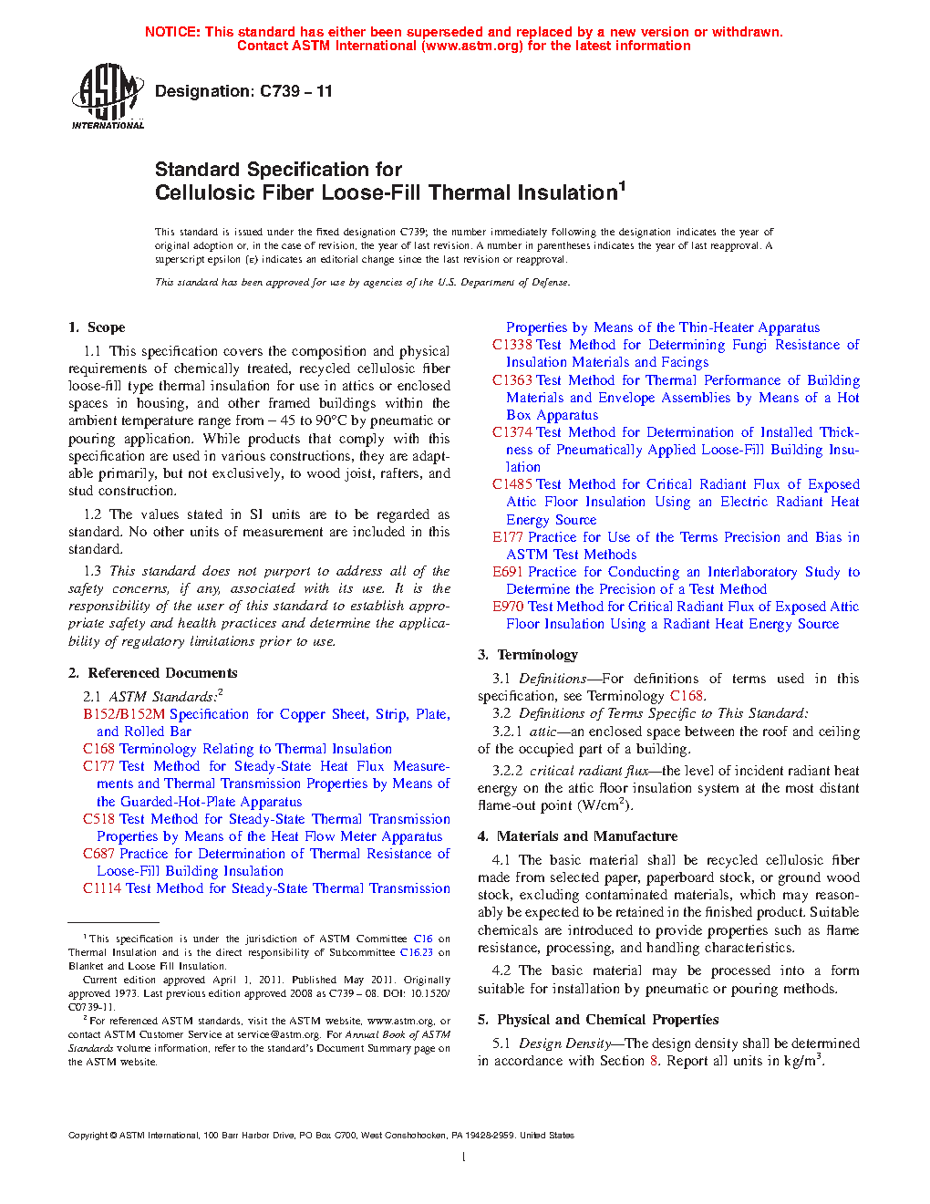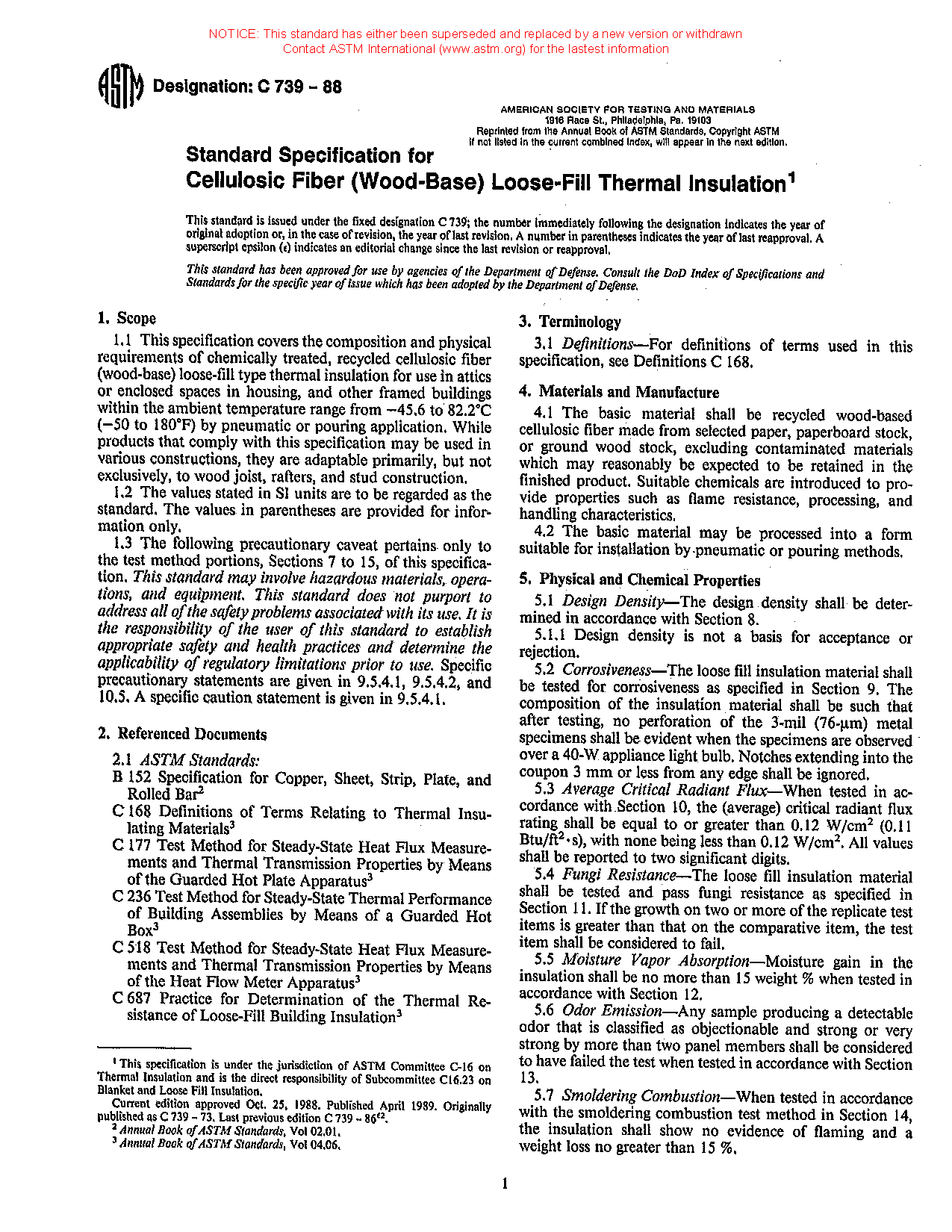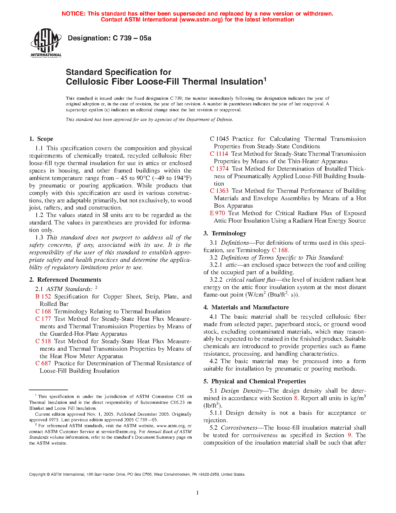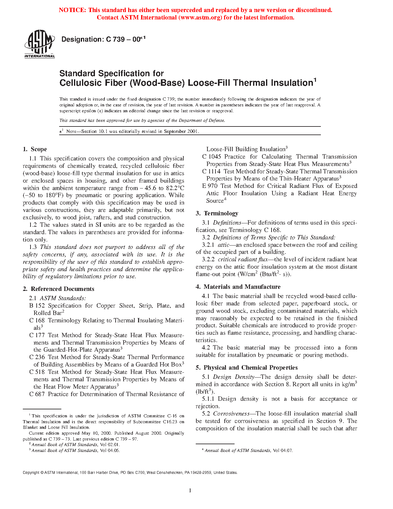This specification covers the composition and physical requirements of chemically treated, recycled cellulosic fiber loose-fill type thermal insulation for installation in attics or enclosed spaces in housing and other buildings by pneumatic or pouring method. While the products are used in various constructions, they are adaptable primarily, but not exclusively, to wood joists, rafters, and stud constructions. The basic material shall be made from selected paper, paperboard stock, or ground wood stock, excluding contaminated materials, which may reasonably be expected to be retained in the finished product. Suitable chemicals are introduced to provide properties such as flame resistance, processing, and handling characteristics. Products shall be prepared suitably to undergo test methods, for which they should comply with the following physical and chemical property requirements: corrosiveness; critical radiant flux; fungi resistance; moisture vapor sorption; odor emission; smoldering combustion; and thermal resistance.