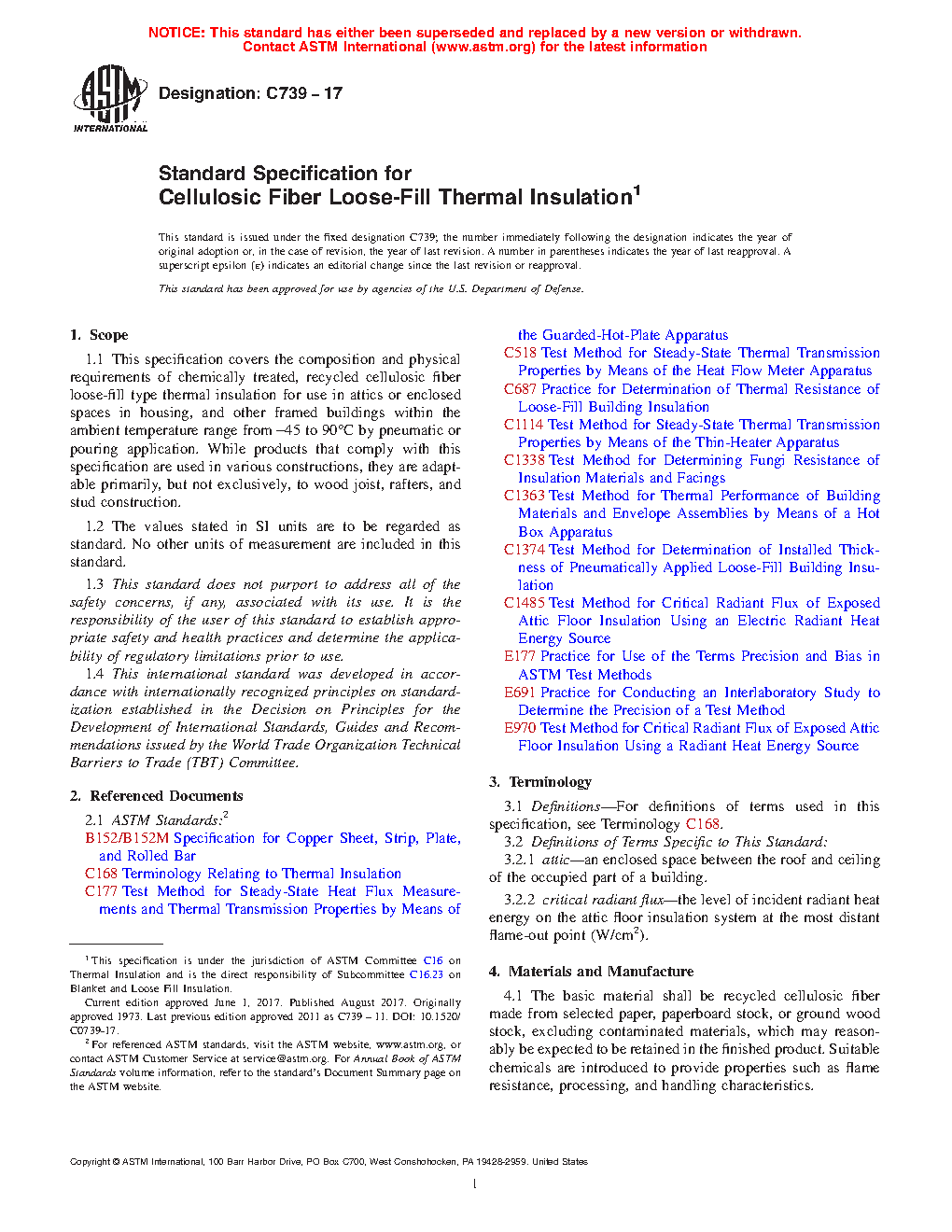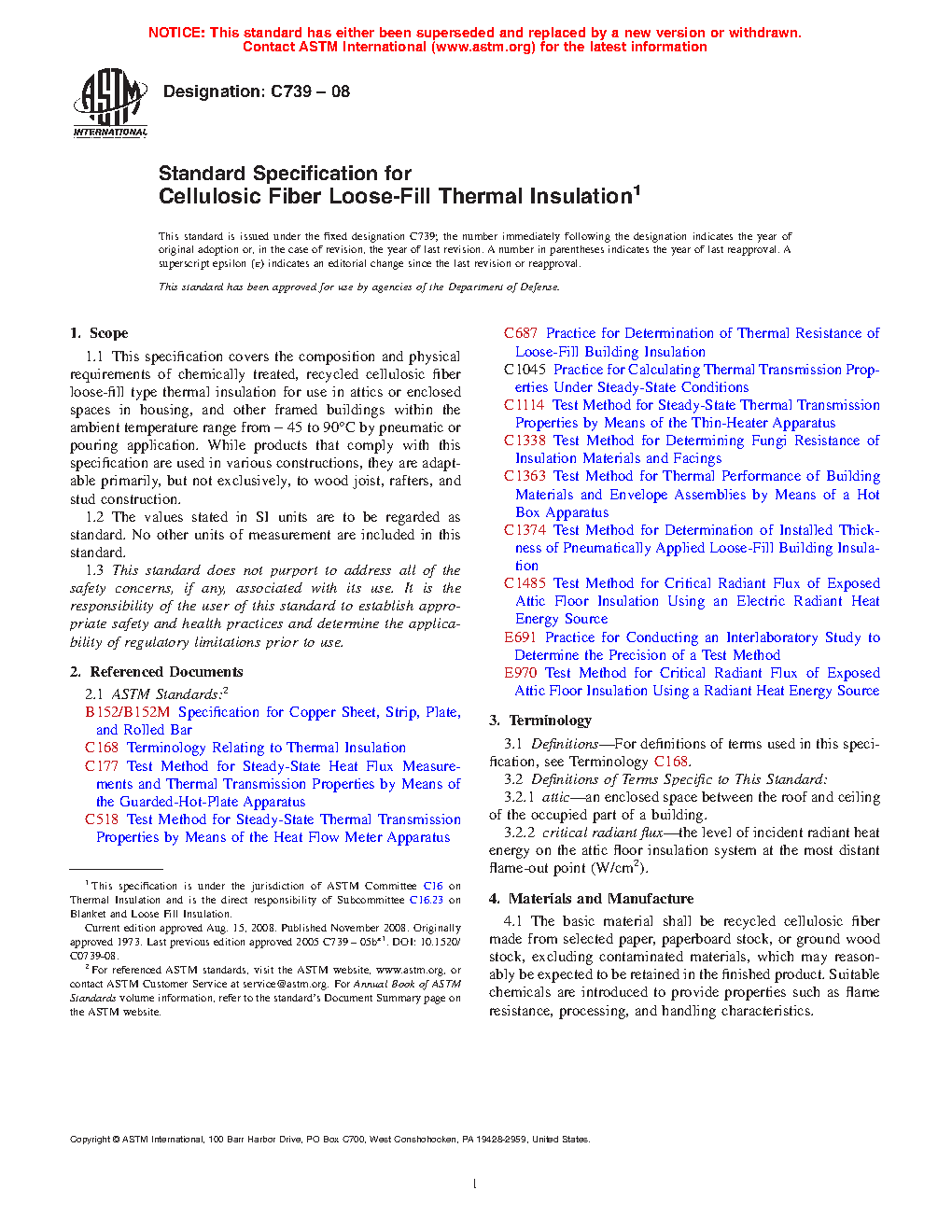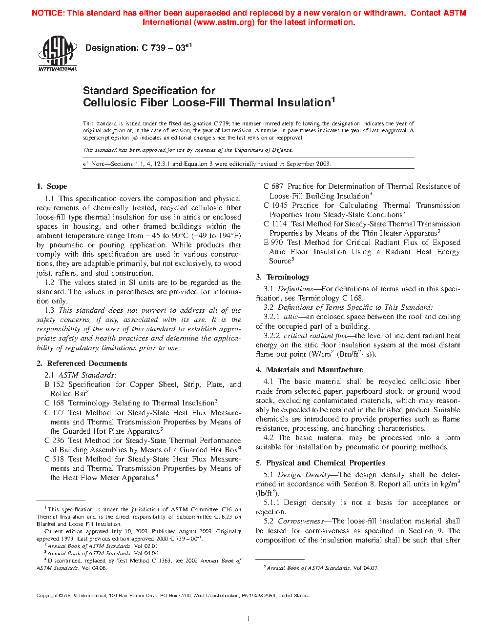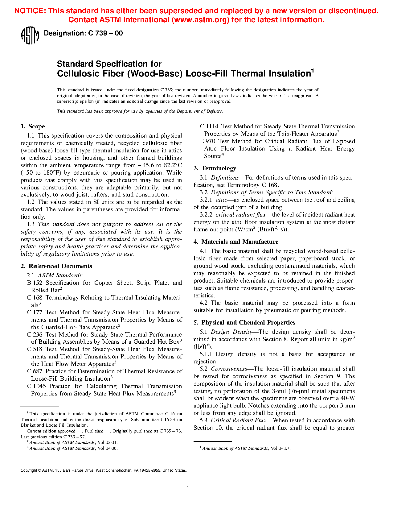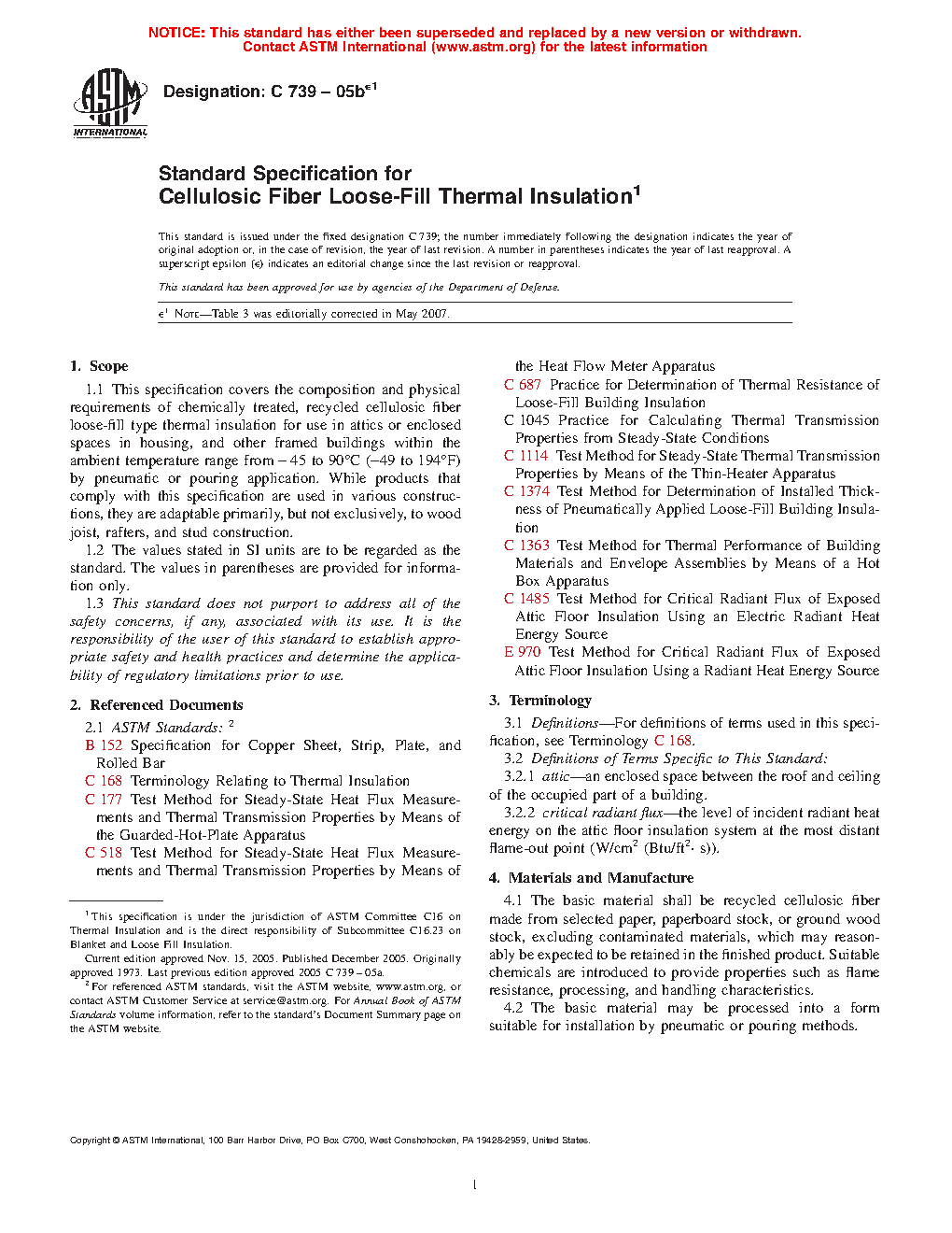 This specification covers the composition and physical requirements of chemically treated, recycled cellulosic fiber loose-fill type thermal insulation for installation in attics or enclosed spaces in housing and other buildings by pneumatic or pouring method. While the products are used in various constructions, they are adaptable primarily, but not exclusively, to wood joists, rafters, and stud constructions. The basic material shall be made from selected paper, paperboard stock, or ground wood stock, excluding contaminated materials, which may reasonably be expected to be retained in the finished product. Suitable chemicals are introduced to provide properties such as flame resistance, processing, and handling characteristics. Products shall be prepared suitably to undergo test methods, for which they should comply with the following physical and chemical property requirements: corrosiveness; critical radiant flux; fungi resistance; moisture vapor sorption; odor emission; smoldering combustion; and thermal resistance.