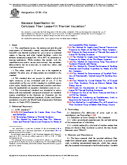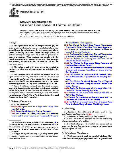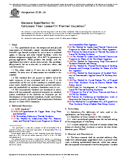1.1 This specification covers the composition and physical requirements of chemically treated, recycled cellulosic fiber loose-fill type thermal insulation for use in attics or enclosed spaces in housing, and other framed buildings within the ambient temperature range from -45 to 90°C by pneumatic or pouring application. While products that comply with this specification are used in various constructions, they are adaptable primarily, but not exclusively, to wood joist, rafters, and stud construction.