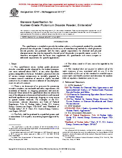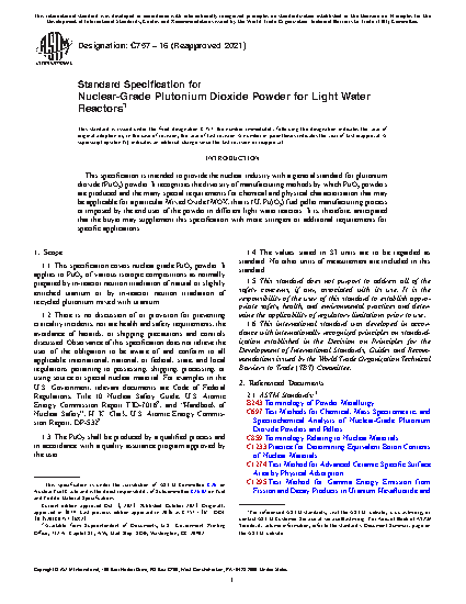 1.1 This specification covers nuclear grade PuO2 powder. It applies to PuO2 of various isotopic compositions as normally prepared by in-reactor neutron irradiation of natural or slightly enriched uranium or by in-reactor neutron irradiation of recycled plutonium mixed with uranium.