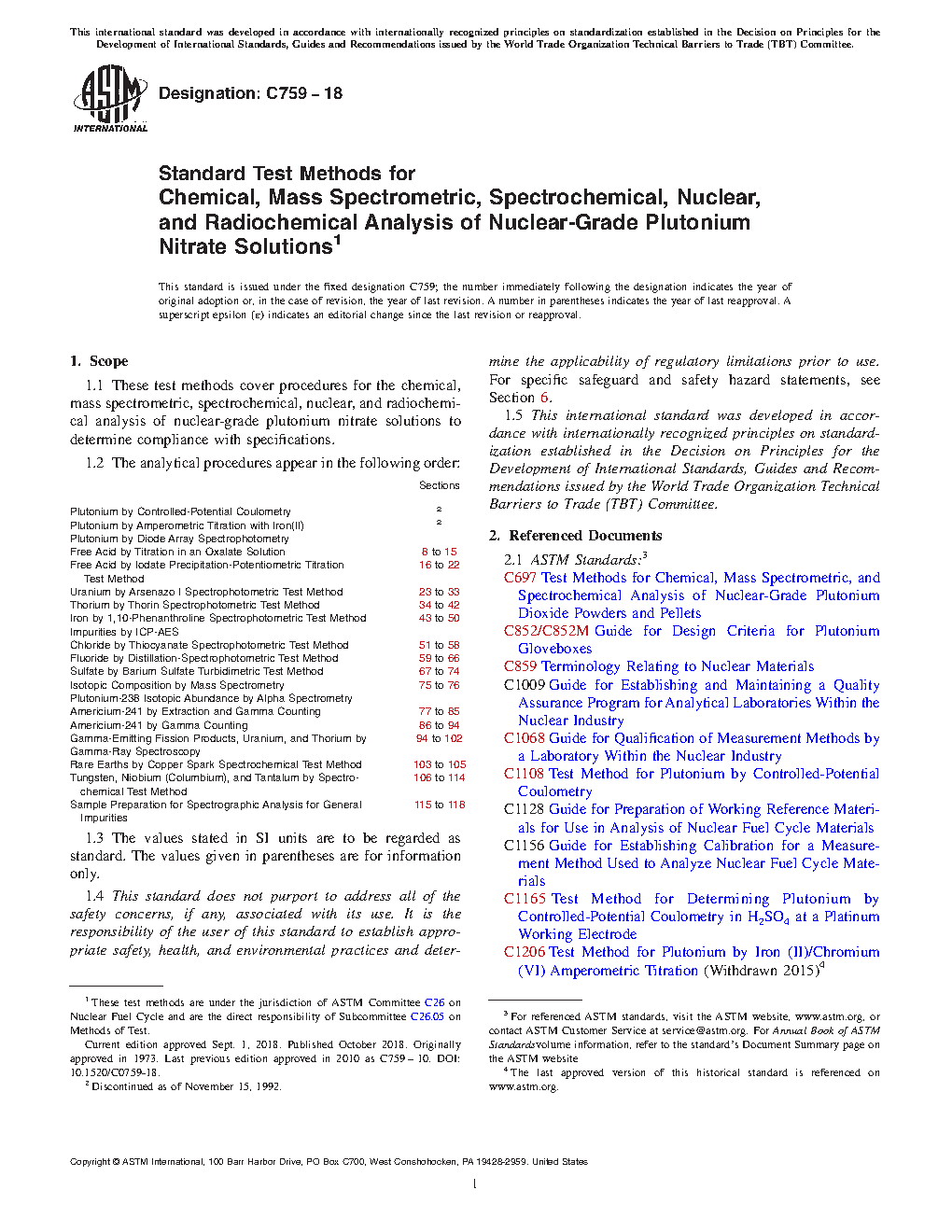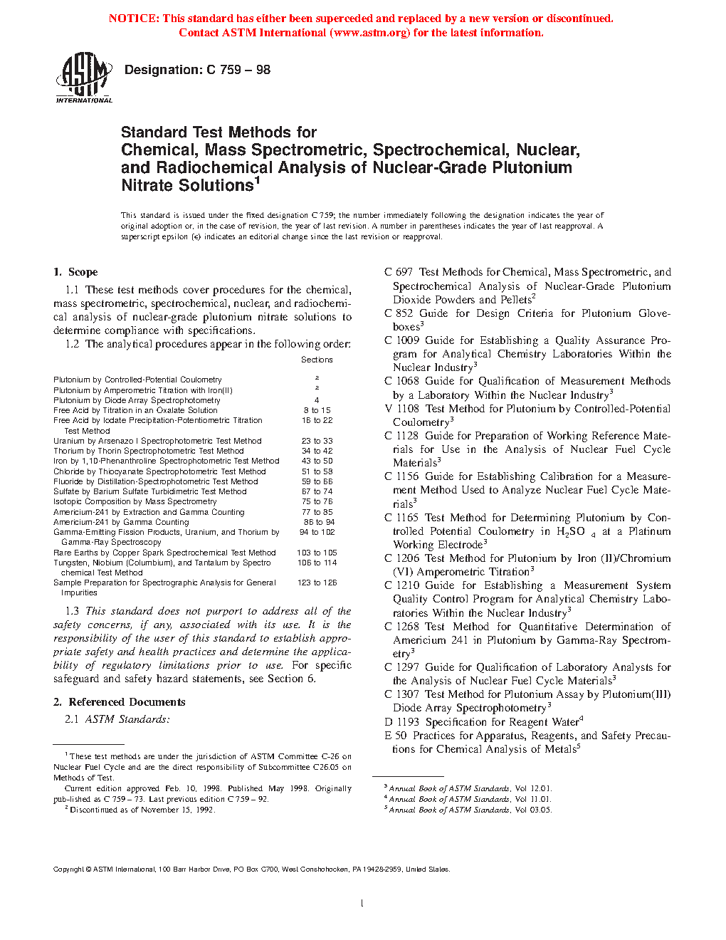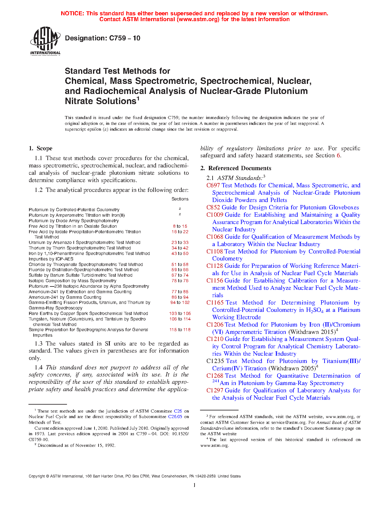 1.1 These test methods cover procedures for the chemical, mass spectrometric, spectrochemical, nuclear, and radiochemical analysis of nuclear-grade plutonium nitrate solutions to determine compliance with specifications.