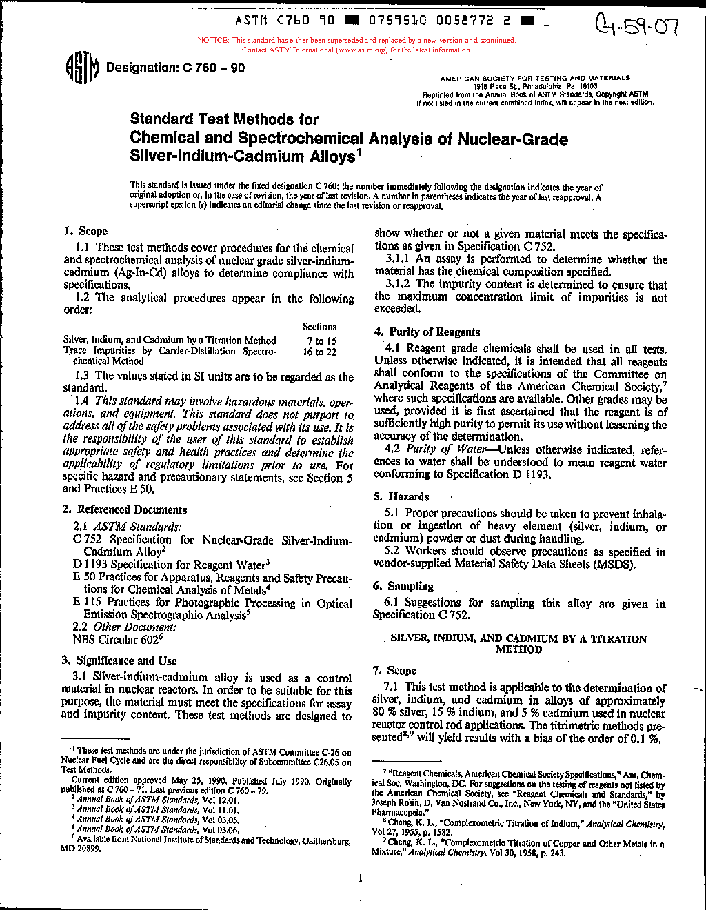 3.1 Silver-indium-cadmium alloy is used as a control material in nuclear reactors. In order to be suitable for this purpose, the material must meet the specifications for assay and impurity content. These test methods are designed to show whether or not a given material meets the specifications as given in Specification C752.
