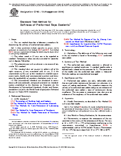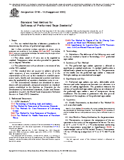 Preformed tape sealants are tacky, deformable solids that are used under compression between two substrates in a variety of sealing applications. This procedure measures the softness of a preformed tape sealant and gives an indication of the preformed tape sealant’ease of compression during installation. The resistance to penetration may also give an indication of the toughness of the preformed tape sealant.