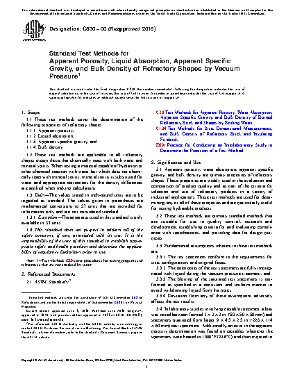 3.1 Apparent porosity, water absorption, apparent specific gravity, and bulk density are primary properties of refractory shapes. These properties are widely used in the evaluation and comparison of product quality and as part of the criteria for selection and use of refractory products in a variety of industrial applications. These test methods are used for determining any or all of these properties and are particularly useful for testing hydratable products.