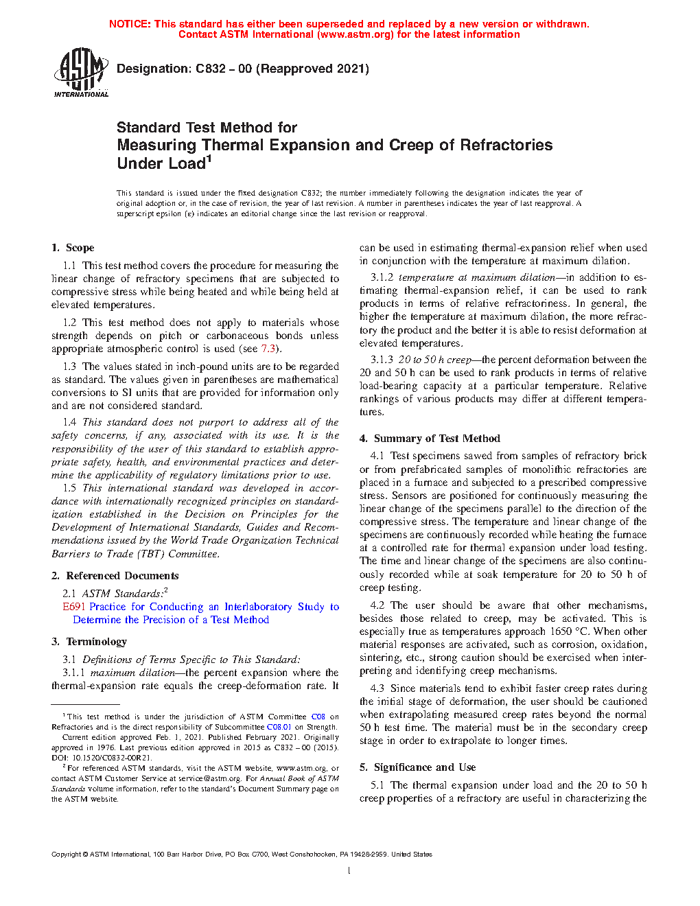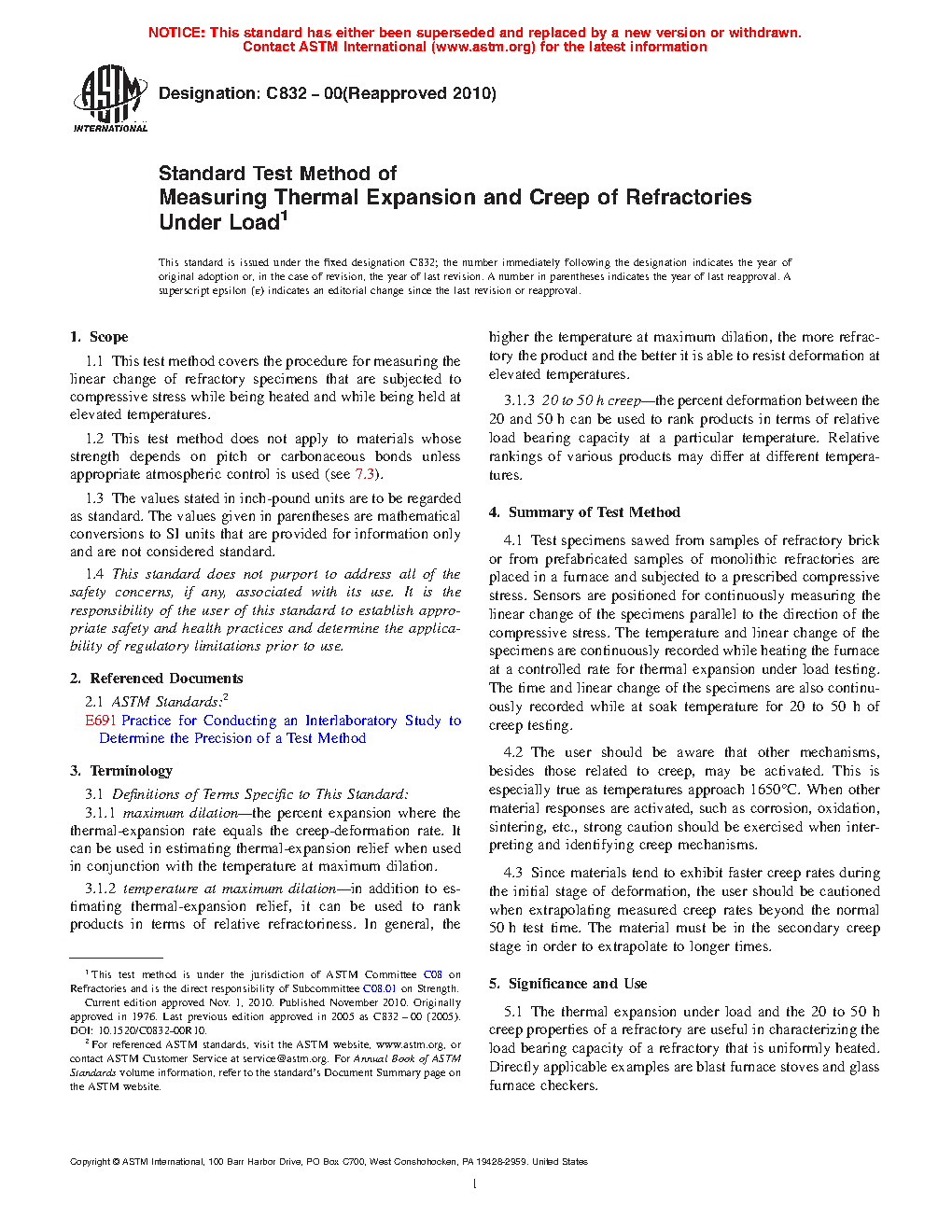 5.1 The thermal expansion under load and the 20 to 50 h creep properties of a refractory are useful in characterizing the load bearing capacity of a refractory that is uniformly heated. Directly applicable examples are blast furnace stoves and glass furnace checkers.