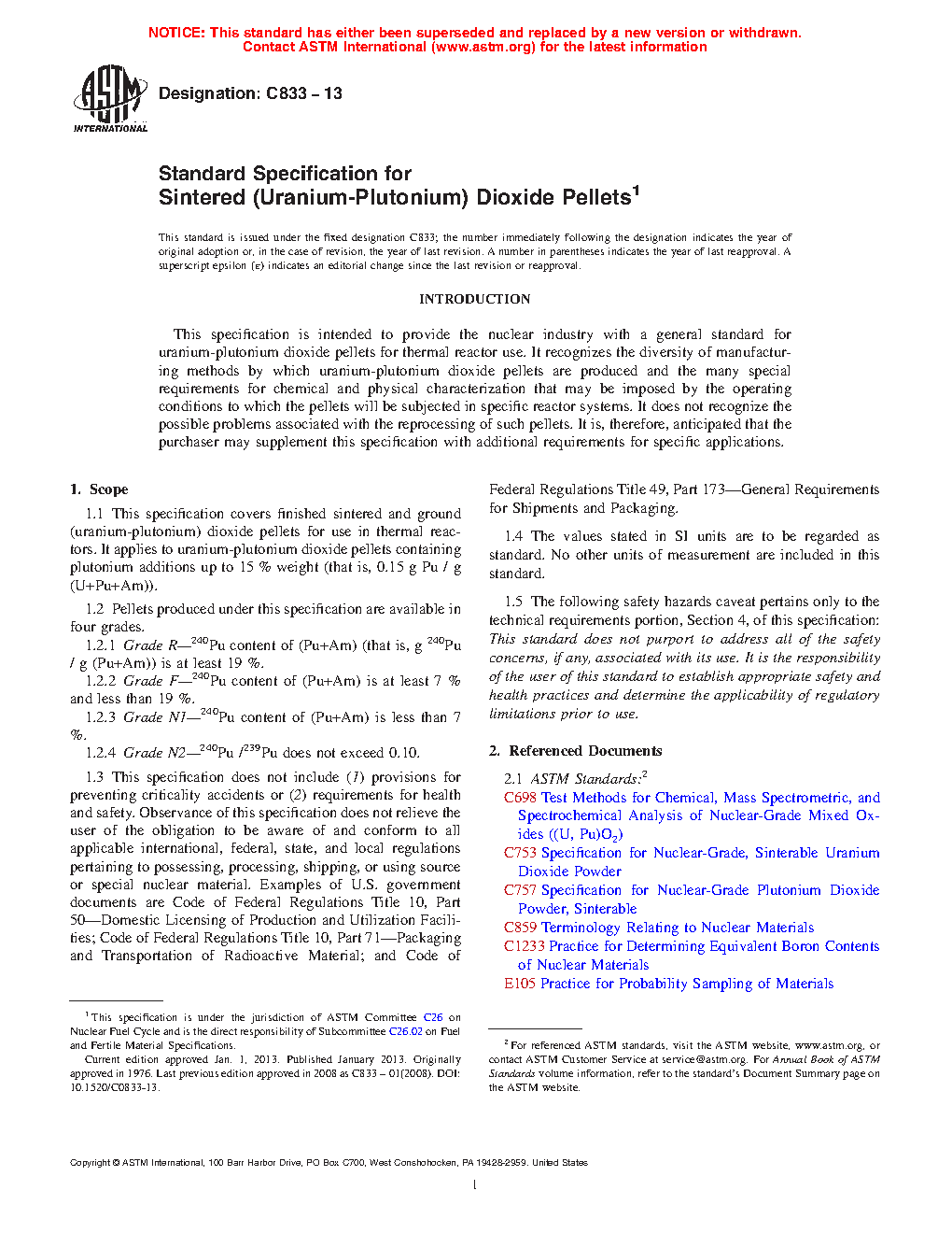 1.3 There is no discussion of or provision for preventing criticality incidents, nor are health and safety requirements, the avoidance of hazards, or shipping precautions and controls discussed. Observance of this specification does not relieve the user of the obligation to be aware of and conform to all applicable international, federal, state, and local regulations pertaining to possessing, processing, shipping, or using source or special nuclear material. Examples of U.S. government documents are Code of Federal Regulations Title 10, Part 50—Domestic Licensing of Production and Utilization Facilities; Code of Federal Regulations Title 10, Part 71—Packaging and Transportation of Radioactive Material; and Code of Federal Regulations Title 49, Part 173—General Requirements for Shipments and Packaging.