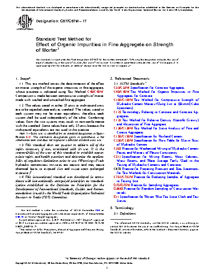 1.1 This test method covers the determination of the effect on mortar strength of the organic impurities in fine aggregate, whose presence is indicated using Test Method C40/C40M. Comparison is made between compressive strengths of mortar made with washed and unwashed fine aggregate.