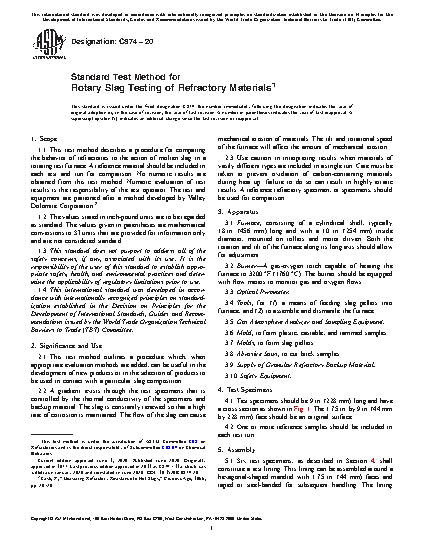 1.1 This practice describes a procedure for comparing the behavior of refractories to the action of molten slag in a rotating test furnace. A reference material should be included in each test and run for comparison. No numeric results are obtained from this practice. Numeric evaluation of test results is the responsibility of the test operator. The test and equipment are patterned after a method developed by Valley Dolomite Corporation.