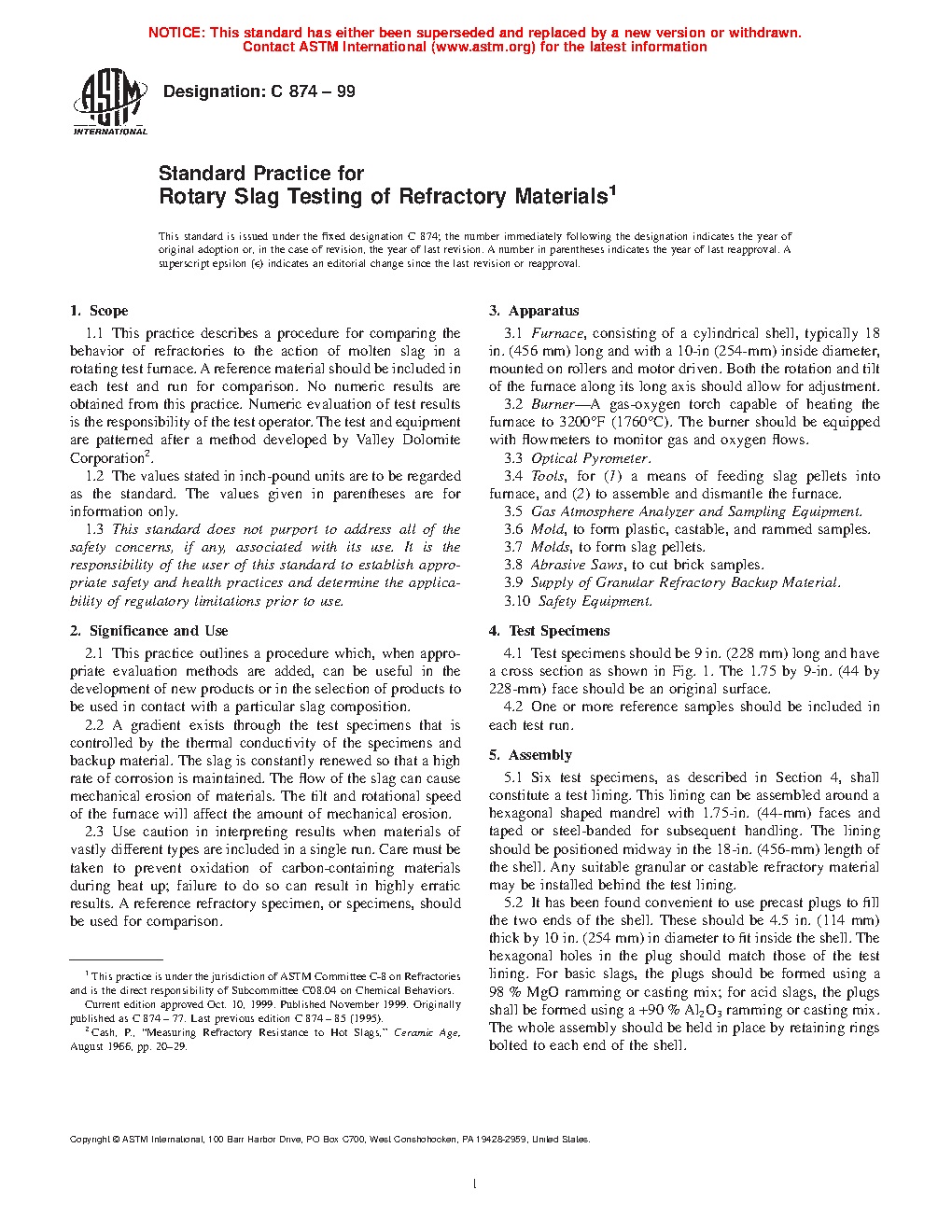This practice outlines a procedure which, when appropriate evaluation methods are added, can be useful in the development of new products or in the selection of products to be used in contact with a particular slag composition.