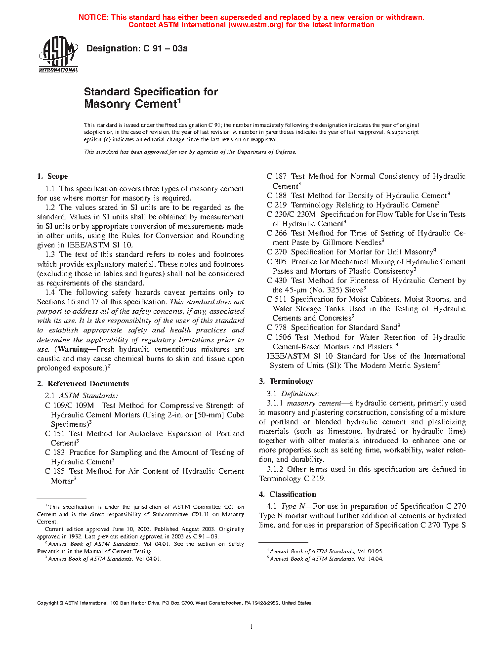 1.1 This specification covers three types of masonry cement for use where mortar for masonry is required.