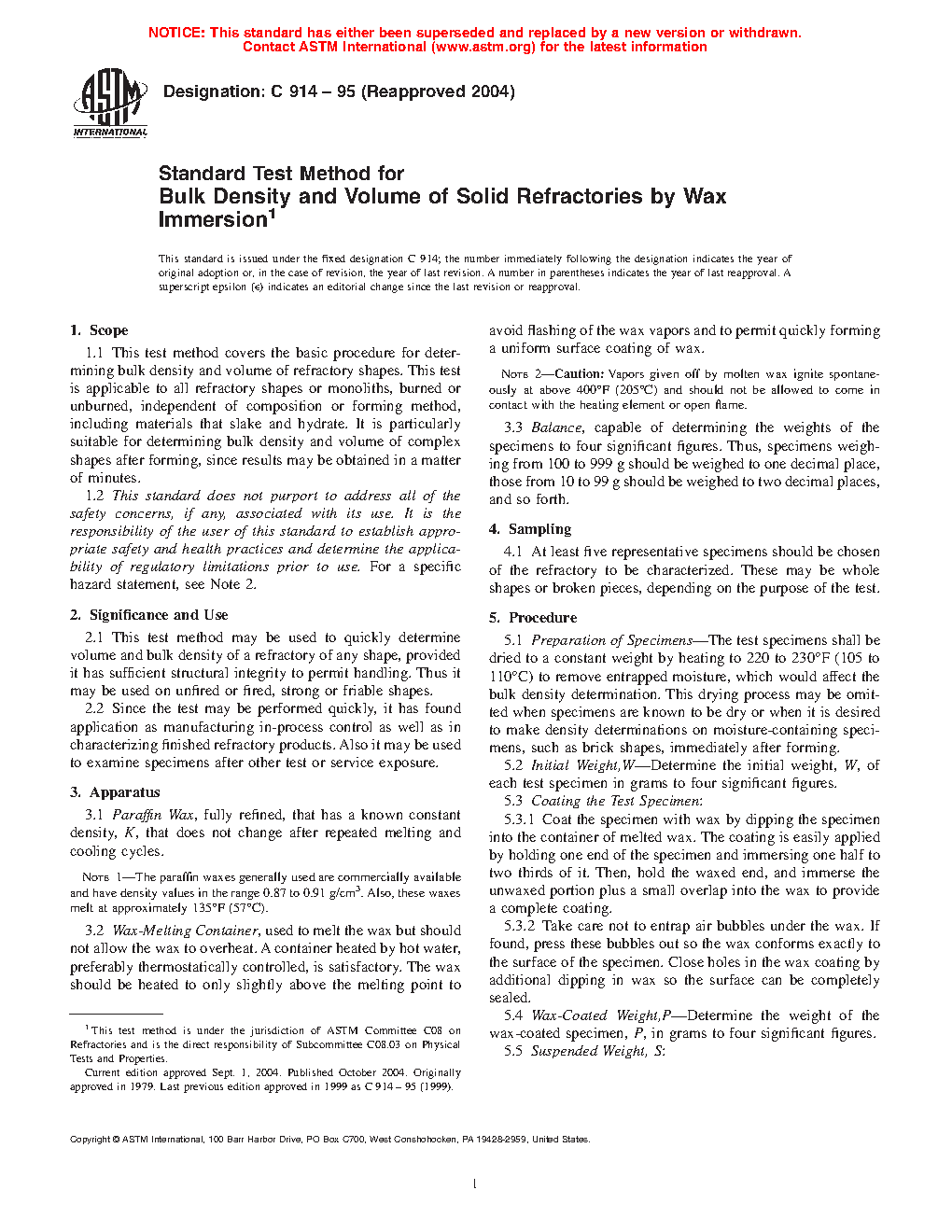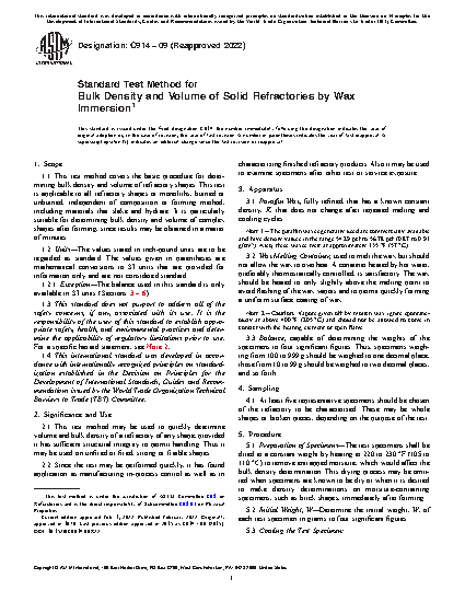 This test method may be used to quickly determine volume and bulk density of a refractory of any shape, provided it has sufficient structural integrity to permit handling. Thus it may be used on unfired or fired, strong or friable shapes.