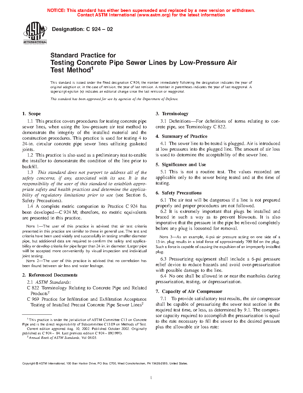 Note 1—The user of this practice is advised that air test criteria presented in this practice are similar to those in general use. The test and criteria have been used widely and successfully in testing smaller diameter pipe, but additional data are required to confirm the safety and applicability or develop criteria for pipe larger than 24 in. in diameter. Larger pipe will be accepted more conveniently by visual inspection and individual joint testing.