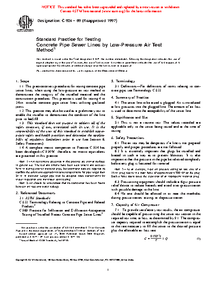 1.1 This practice covers procedures for testing concrete pipe sewer lines, when using the low-pressure air test method to demonstrate the integrity of the installed material and the construction procedures. This practice is used for testing 4 to 24-in. circular concrete pipe sewer lines utilizing gasketed joints.