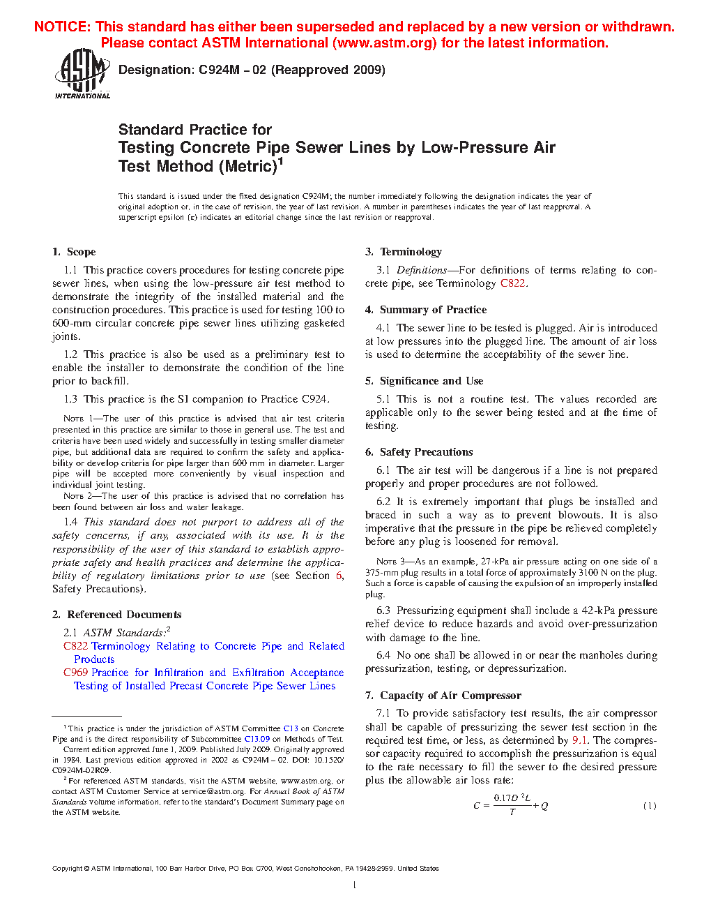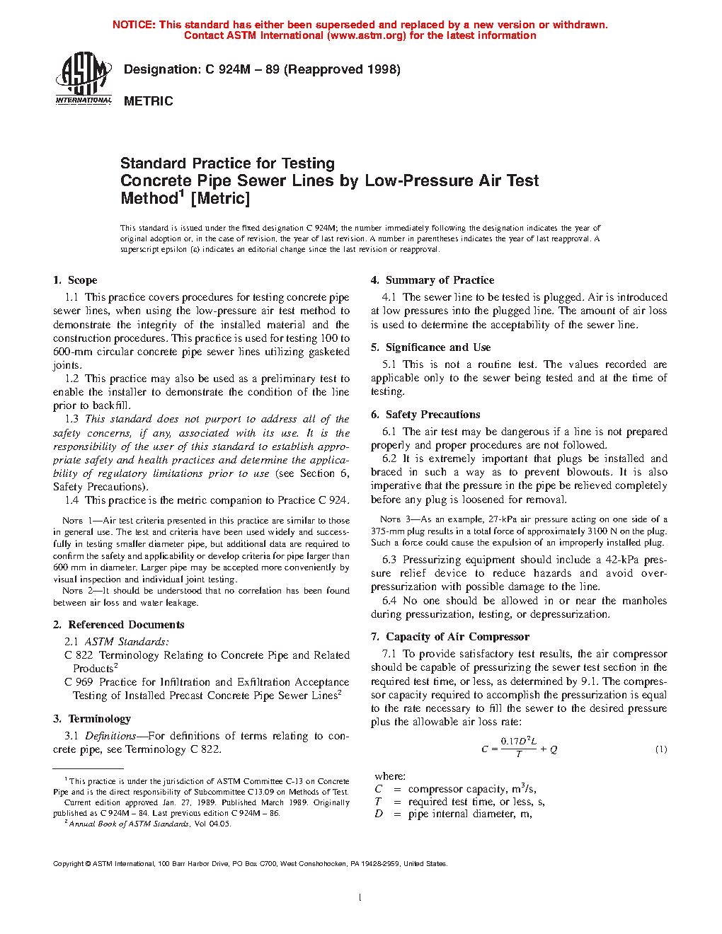 Note 1—The user of this practice is advised that air test criteria presented in this practice are similar to those in general use. The test and criteria have been used widely and successfully in testing smaller diameter pipe, but additional data are required to confirm the safety and applicability or develop criteria for pipe larger than 600 mm in diameter. Larger pipe will be accepted more conveniently by visual inspection and individual joint testing.