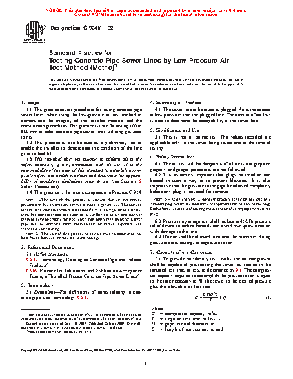 1.1 This practice covers procedures for testing concrete pipe sewer lines, when using the low-pressure air test method to demonstrate the integrity of the installed material and the construction procedures. This practice is used for testing 100 to 600-mm circular concrete pipe sewer lines utilizing gasketed joints.