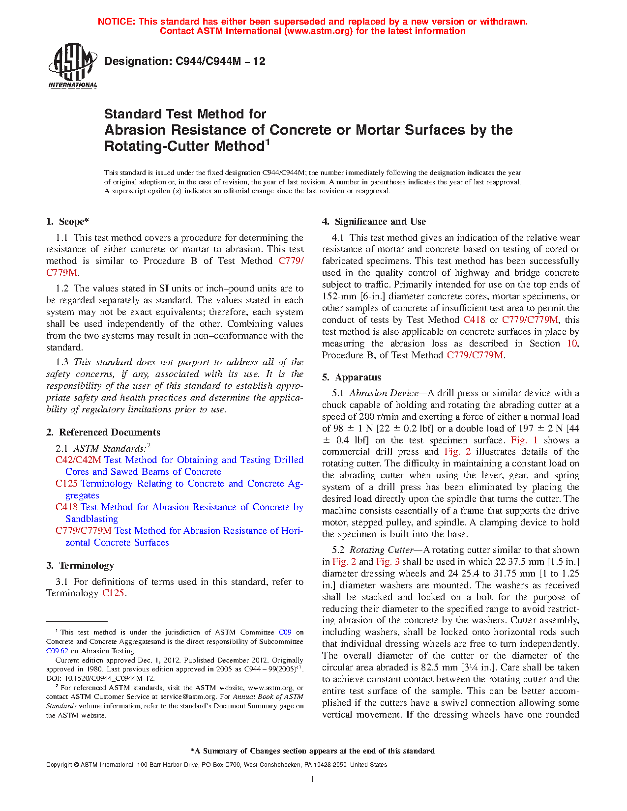 1.1 This test method covers a procedure for determining the resistance of either concrete or mortar to abrasion. This test method is similar to Procedure B of Test Method C779/C779M.