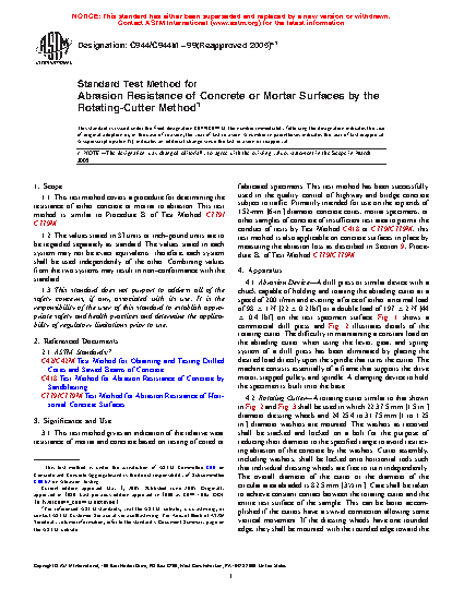 This test method covers the procedure for determining the abrasion resistance of either concrete or mortar surfaces using the rotating-cutter method. The method involves an abrasion device, a rotating cutter, a balance and a leveling plate. The surface description, size, and finish type of the specimen, as well as the concrete compaction, age, and strength; applied surface treatment; abrasion time; load used; depth of wear; mass loss; and abrasion time are reported. This test method has been successfully used in the quality control of highway and bridge concrete subject to traffic.
