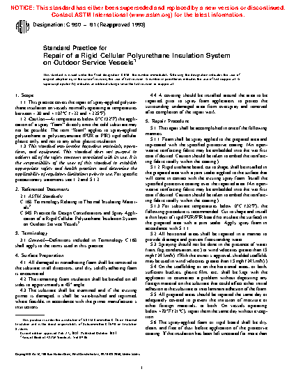 1.1 This practice covers the repair of spray-applied polyurethane insulation on vessels normally operating at temperatures between 30 and + 107°C (22 and + 225°F).