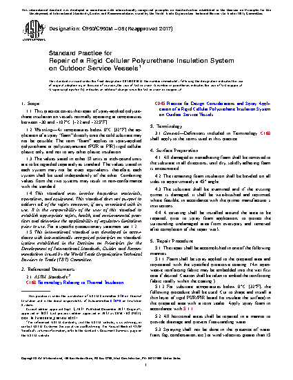 1.1 This practice covers the repair of spray-applied polyurethane insulation on vessels normally operating at temperatures between − 30 and + 107°C [−22 and + 225°F].