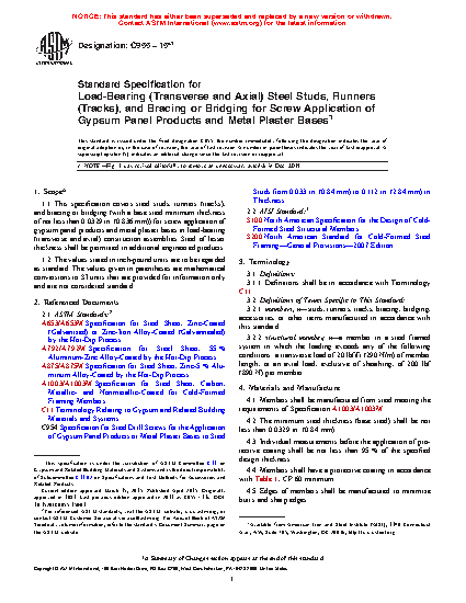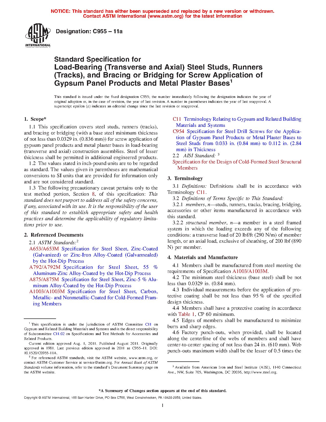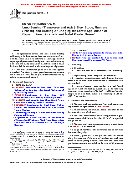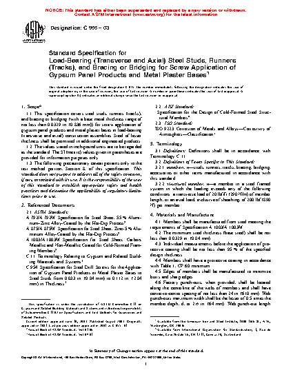 1.1 This specification covers steel studs, runners (tracks), and bracing or bridging (with a base metal thickness range of not less than 0.0329 in. (0.836 mm)) for screw application of gypsum panel products and metal plaster bases in load-bearing (transverse and axial) construction assemblies. Steel of lesser thickness shall be permitted in additional engineered products.