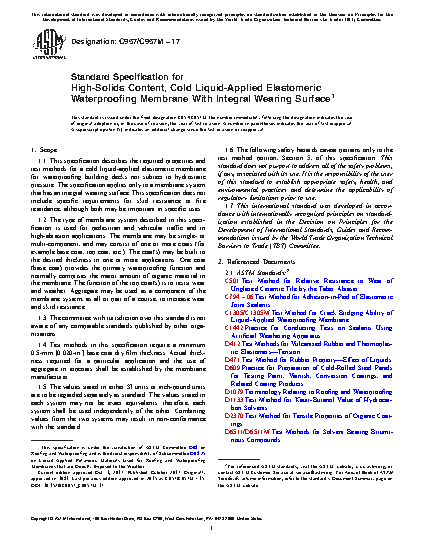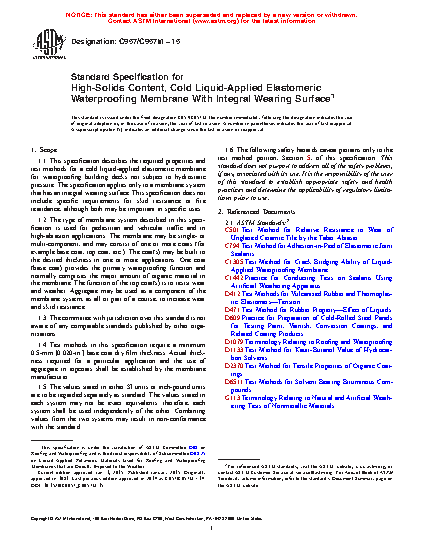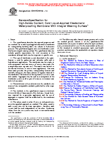 1.1 This specification describes the required properties and test methods for a cold liquid-applied elastomeric membrane for waterproofing building decks not subject to hydrostatic pressure. The specification applies only to a membrane system that has an integral wearing surface. This specification does not include specific requirements for skid resistance or fire retardance, although both may be important in specific uses.