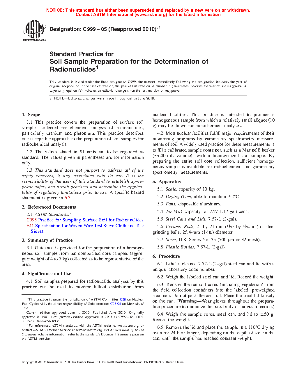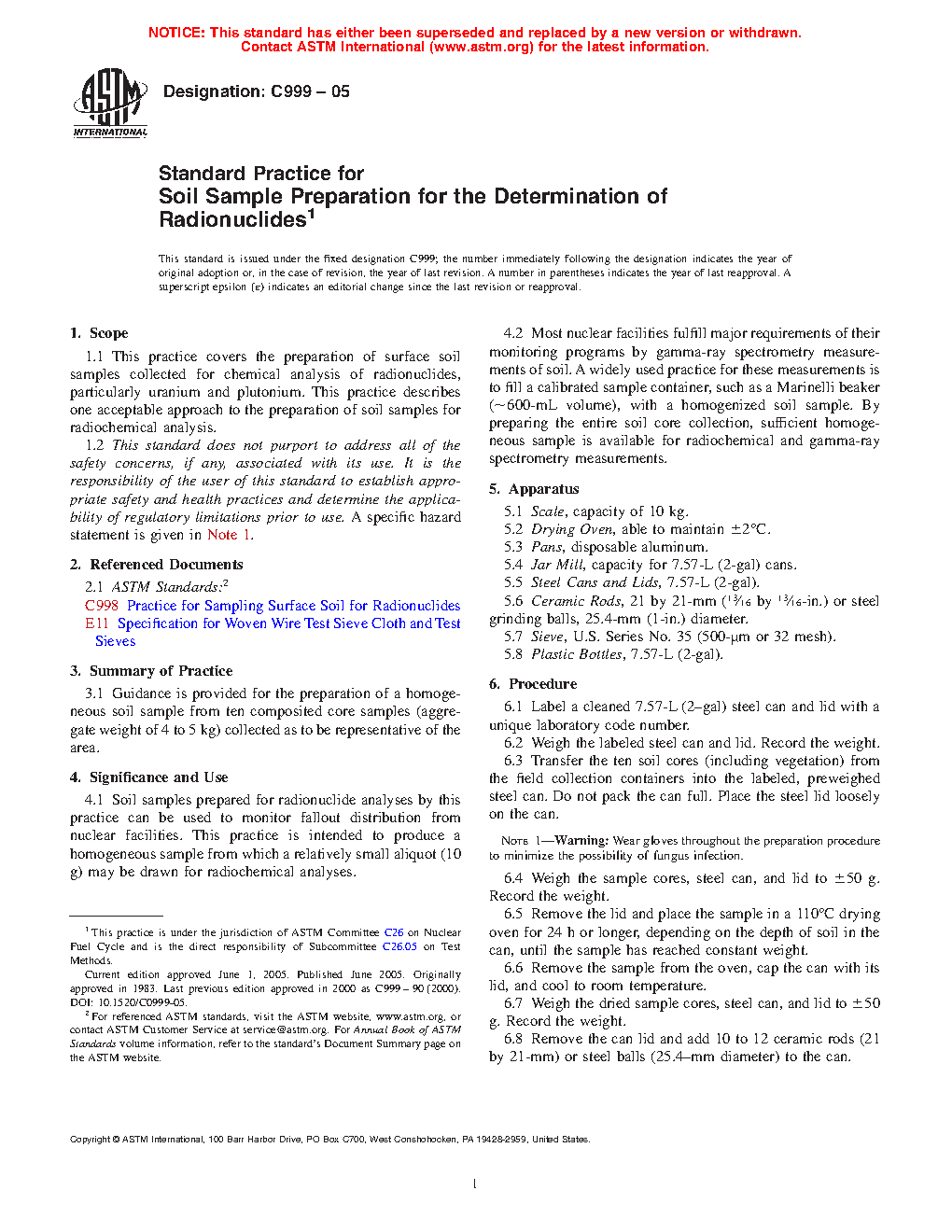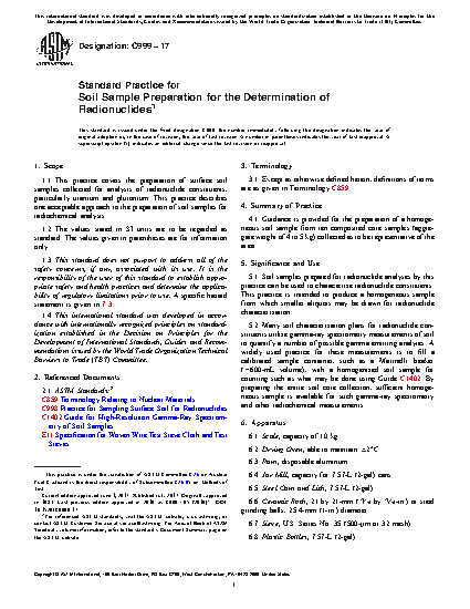 1.1 This practice covers the preparation of surface soil samples collected for analysis of radionuclide constituents, particularly uranium and plutonium. This practice describes one acceptable approach to the preparation of soil samples for radiochemical analysis.