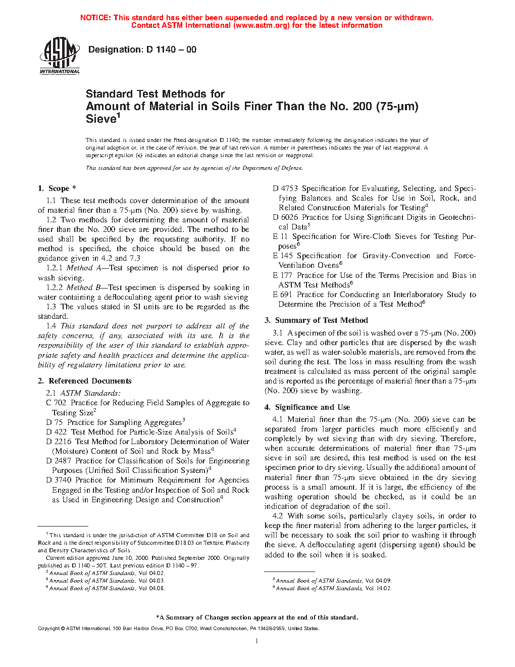 1.1 These test methods cover the determination of the amount of material finer than a 75-μm (No. 200) sieve by washing of material with a maximum particle size of 75 mm (3 in.).