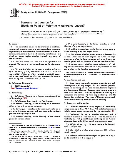 1.1 This test method covers the determination of the blocking point of a thermoplastic or a hygroscopic layer or coating of potentially adhesive material. Potentially adhesive materials comprise those materials in a substantially nonadhesive state which may be activated to an adhesive state by application of heat or solvents.