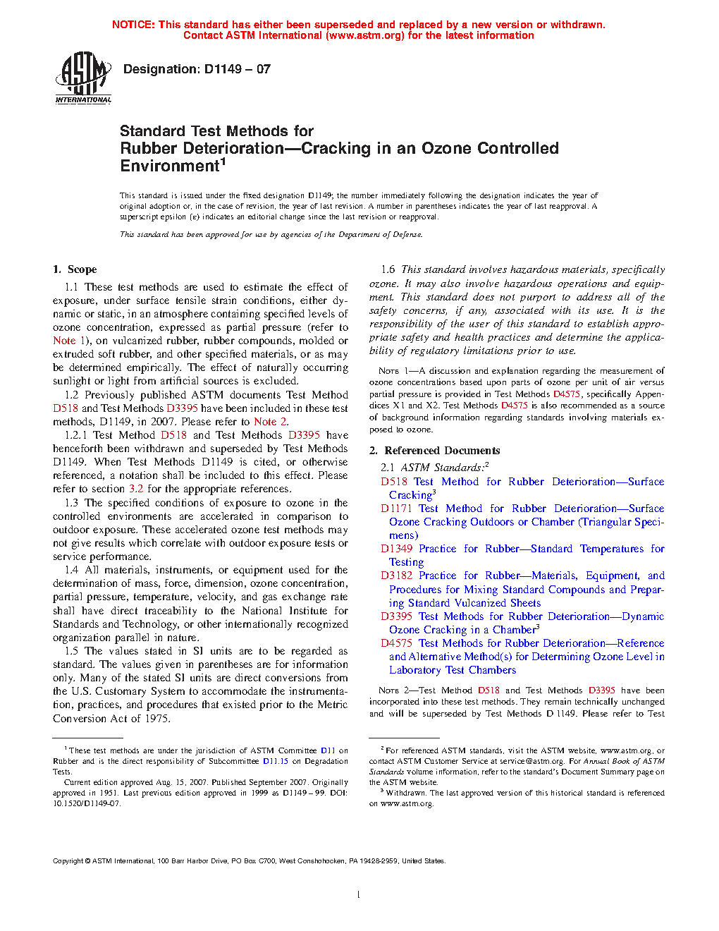 1.2.1 Test Method D518 and Test Methods D3395 have henceforth been withdrawn and superseded by Test Methods D1149. When Test Methods D1149 is cited, or otherwise referenced, a notation shall be included to this effect. Please refer to section 3.2 for the appropriate references.