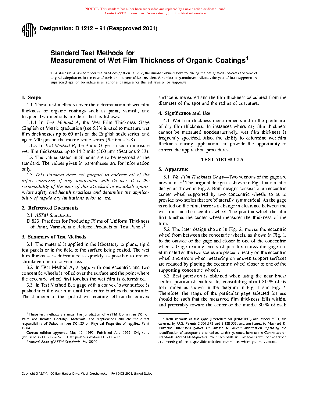 1.1.1 In Test Method A, the Wet Film Thickness Gage (English or Metric graduation (see 5.1)) is used to measure wet film thicknesses up to 60 mils on the English scale series, and up to 700 µm on the metric scale series (Sections 5 – 8).