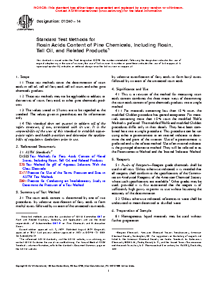 1.2 These test methods may not be applicable to adducts or derivatives of rosin, fatty acid, or other pine chemicals products.