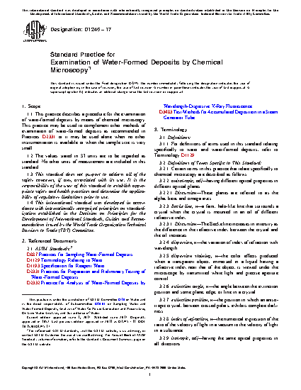 1.1 This practice describes a procedure for the examination of water-formed deposits by means of chemical microscopy. This practice may be used to complement other methods of examination of water-formed deposits as recommended in Practices D2331 or it may be used alone when no other instrumentation is available or when the sample size is very small.