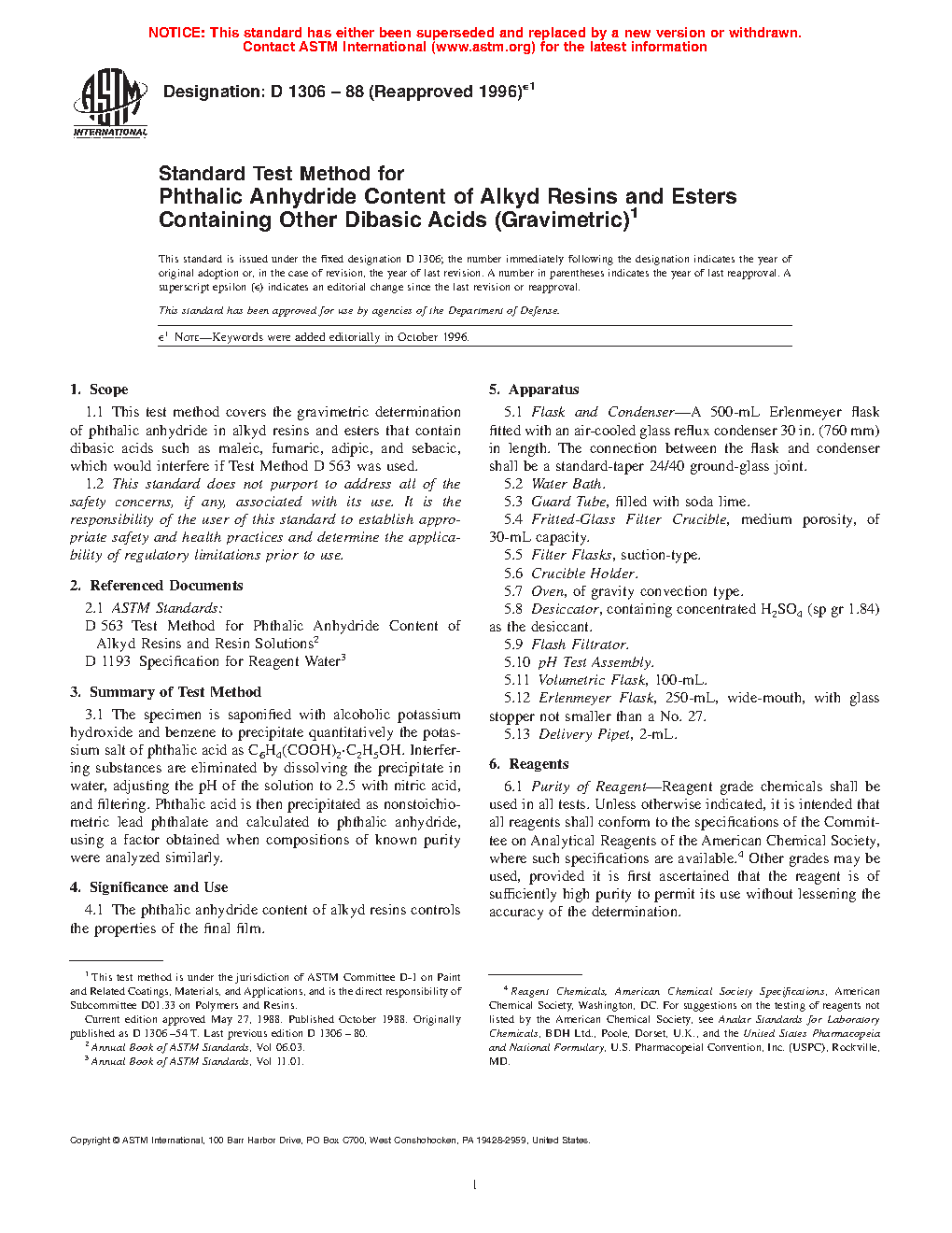Standard Test Method for Phthalic Anhydride Content of Alkyd Resins and Esters Containing Other Dibasic Acids (Gravimetric) (Withdrawn 2004)