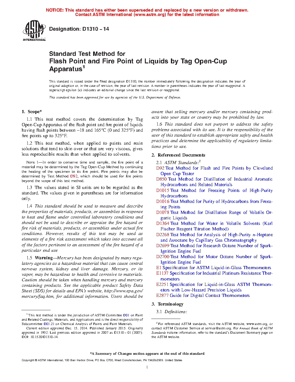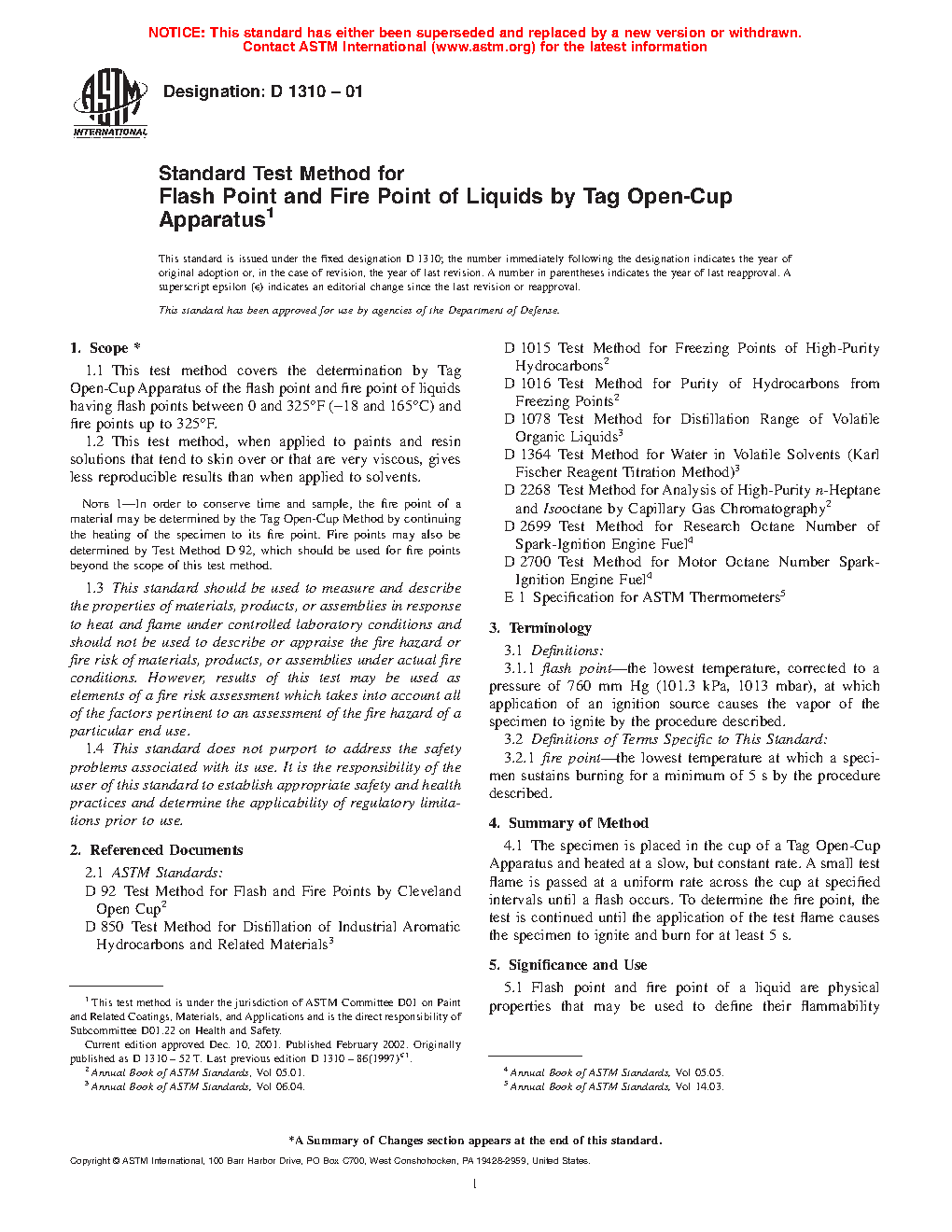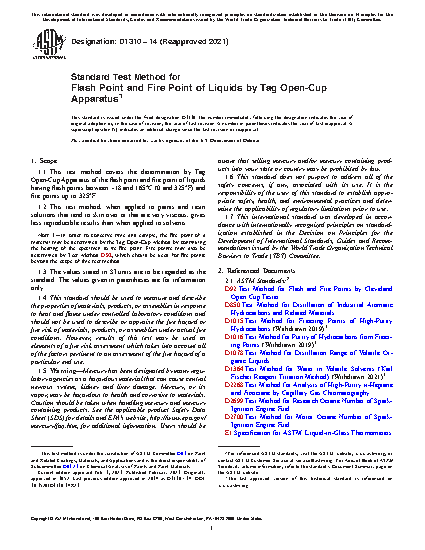 1.1 This test method covers the determination by Tag Open-Cup Apparatus of the flash point and fire point of liquids having flash points between -18 and 165°C (0 and 325°F) and fire points up to 325°F.