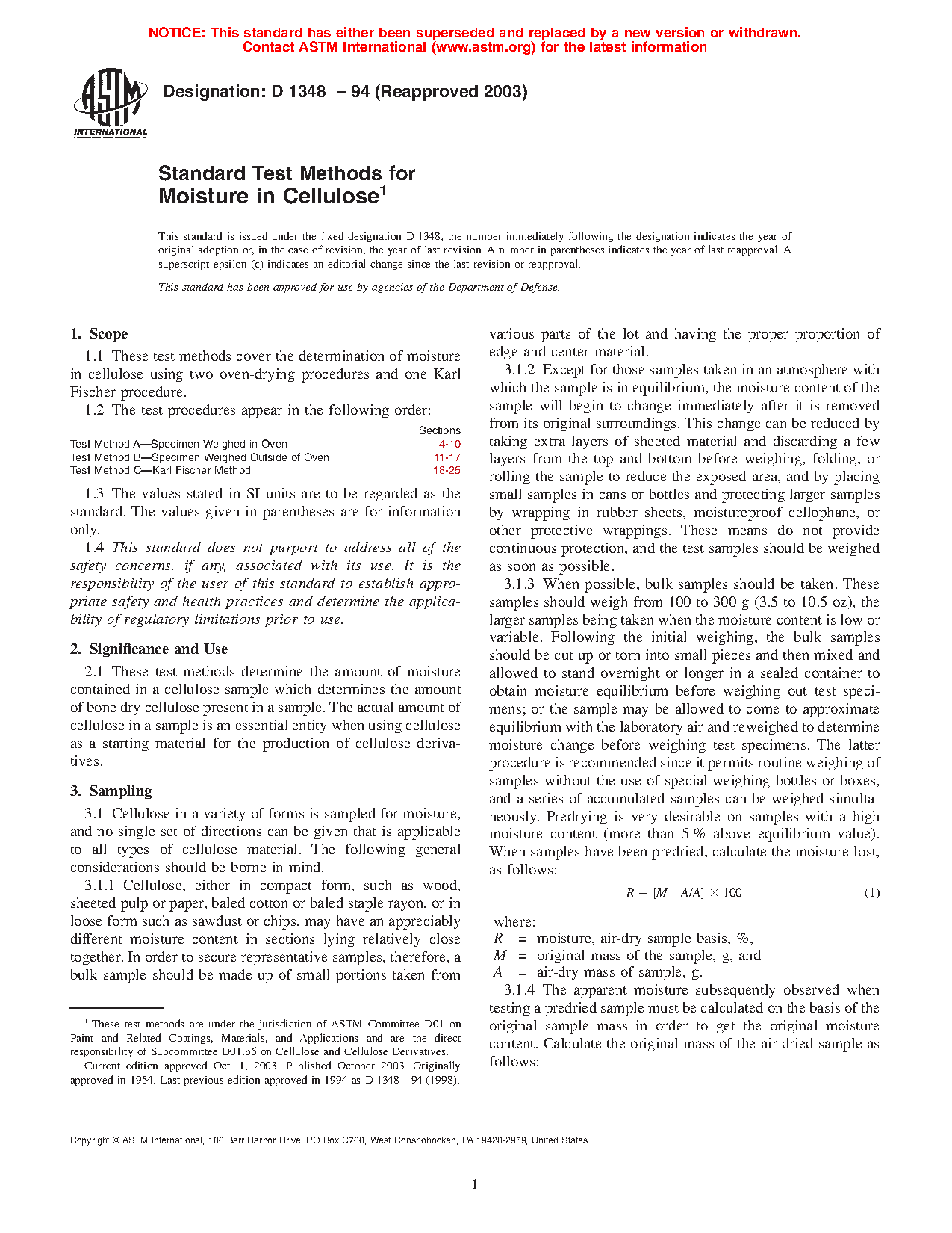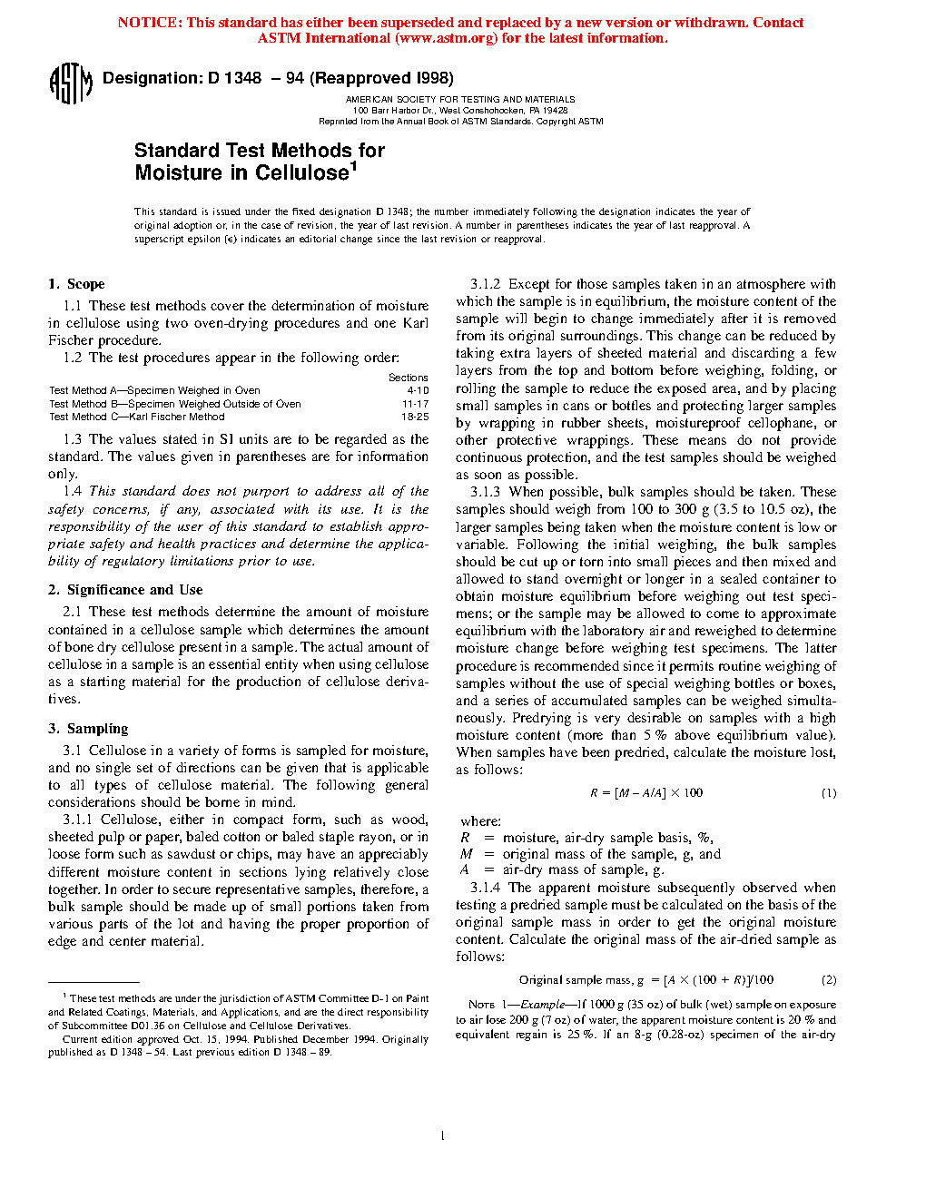 1.1 These test methods cover the determination of moisture in cellulose using two oven-drying procedures and one Karl Fischer procedure.