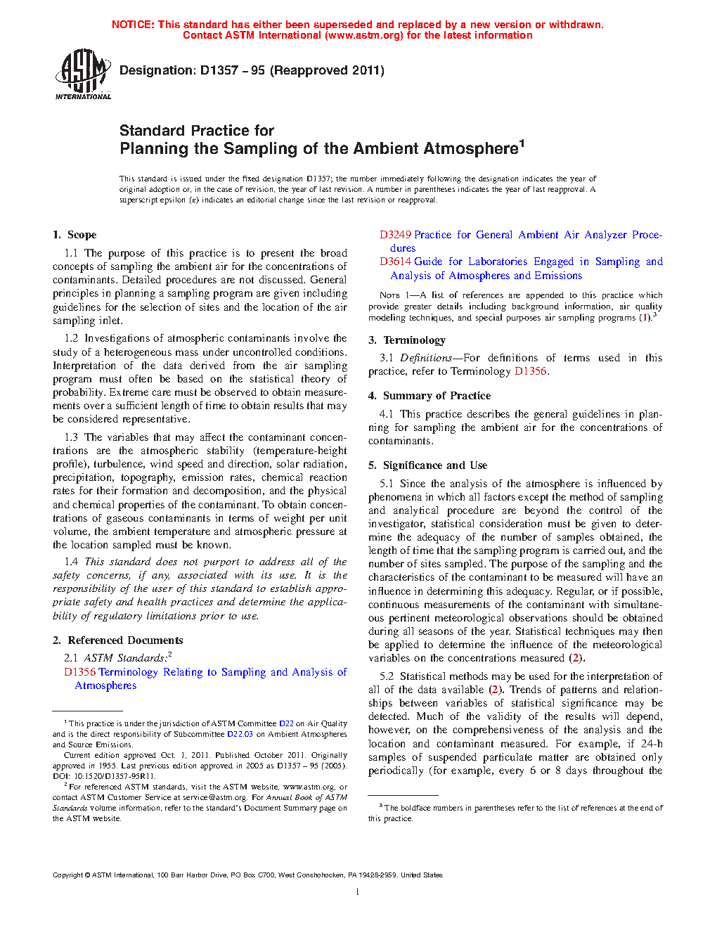1.1 The purpose of this practice is to present the broad concepts of sampling the ambient air for the concentrations of contaminants. Detailed procedures are not discussed. General principles in planning a sampling program are given including guidelines for the selection of sites and the location of the air sampling inlet.