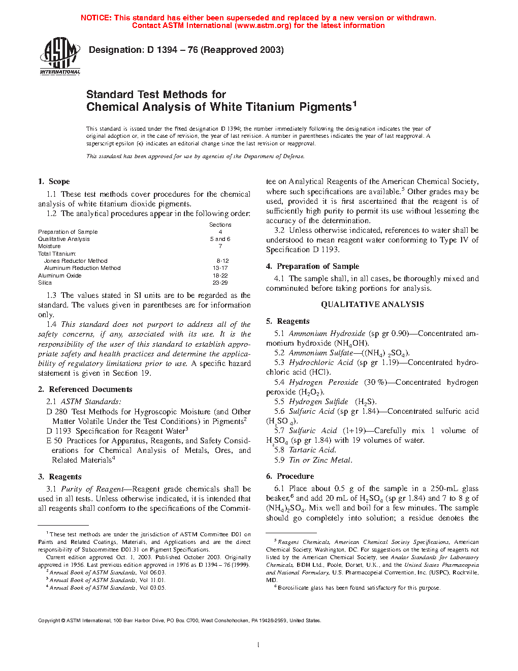 These test methods cover procedures for the chemical analysis of white titanium dioxide pigments. The analytical procedures appear in the following order: sample preparation, qualitative analysis, moisture content determination, total titanium content determination by Jones Reductor and Aluminum Reduction methods, aluminum oxide content determination, and silica content determination. The reagents to be used shall include ammonium hydroxide, ammonium sulfate, hydrochloric acid, hydrogen peroxide, hydrogen sulfide, sulfuric acid, tartaric acid, tin, zinc, carbon steel, iron, ferric sulfate solution, nitric acid, sodium oxalate, potassium permanganate, aluminum metal foil, ammonium thiocyanate indicator solution, ferritic ammonium sulfate solution, sodium bicarbonate solution, sulfuric acid, titanium dioxide, acetic acid, ammonium phosphate, EDTA solution, methyl orange indicator solution, sodium bisulfate monohydrate, sodium fluoride, xylenol orange indicator solution, and zinc sulfate solution.