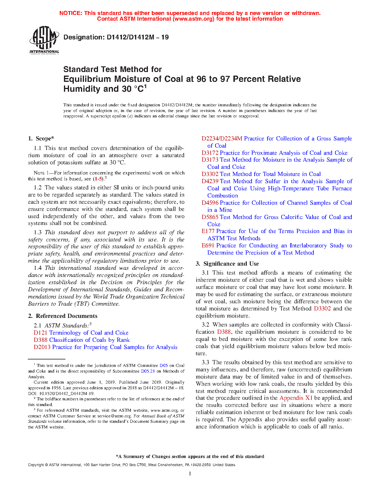 3.2 When samples are collected in conformity with Classification D388, the equilibrium moisture is considered to be equal to bed moisture with the exception of some low rank coals that yield equilibrium moisture values below bed moisture.